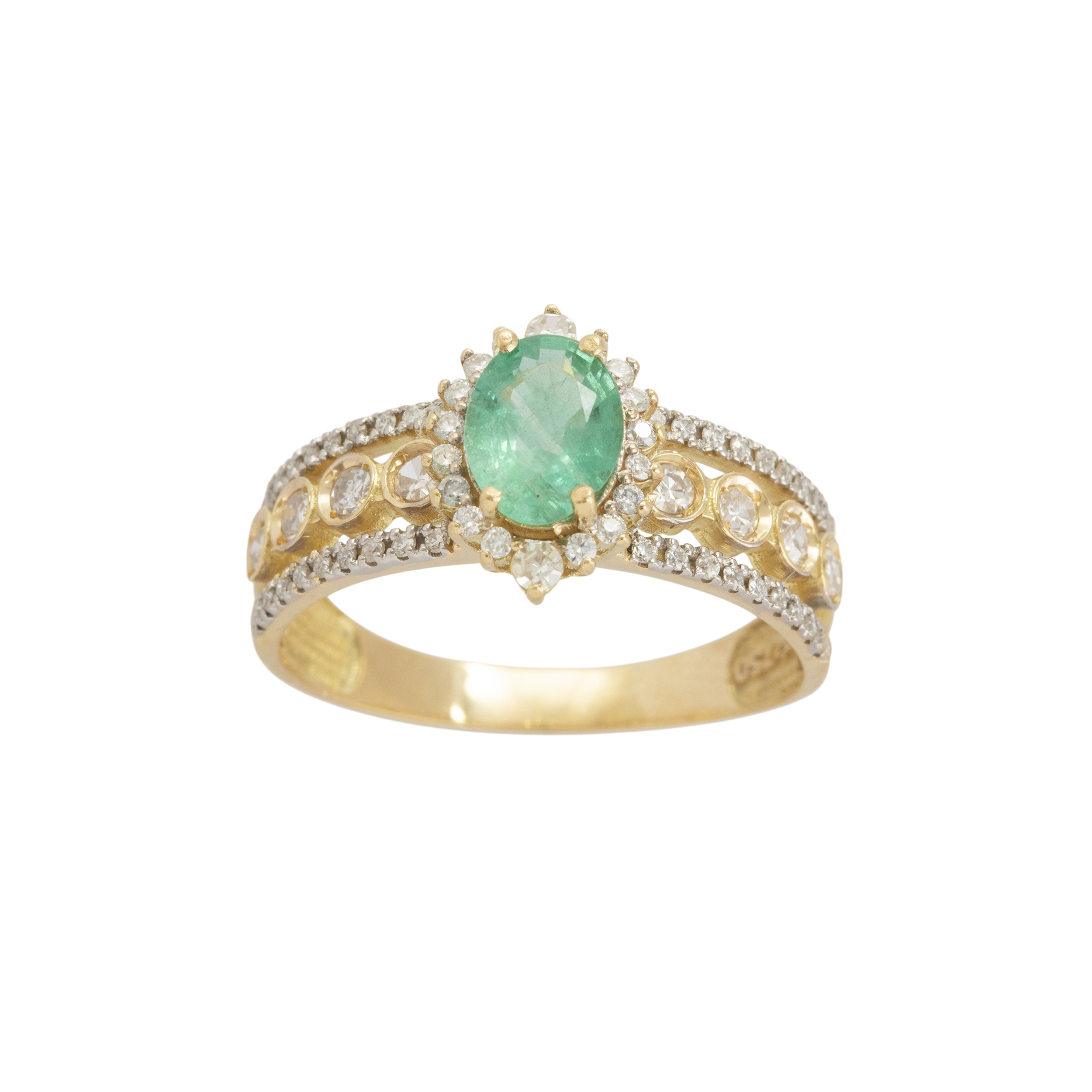 Anel de ouro amarelo com 1,00ct de esmeralda e 0,64ct de brilhantes. Medida 25.