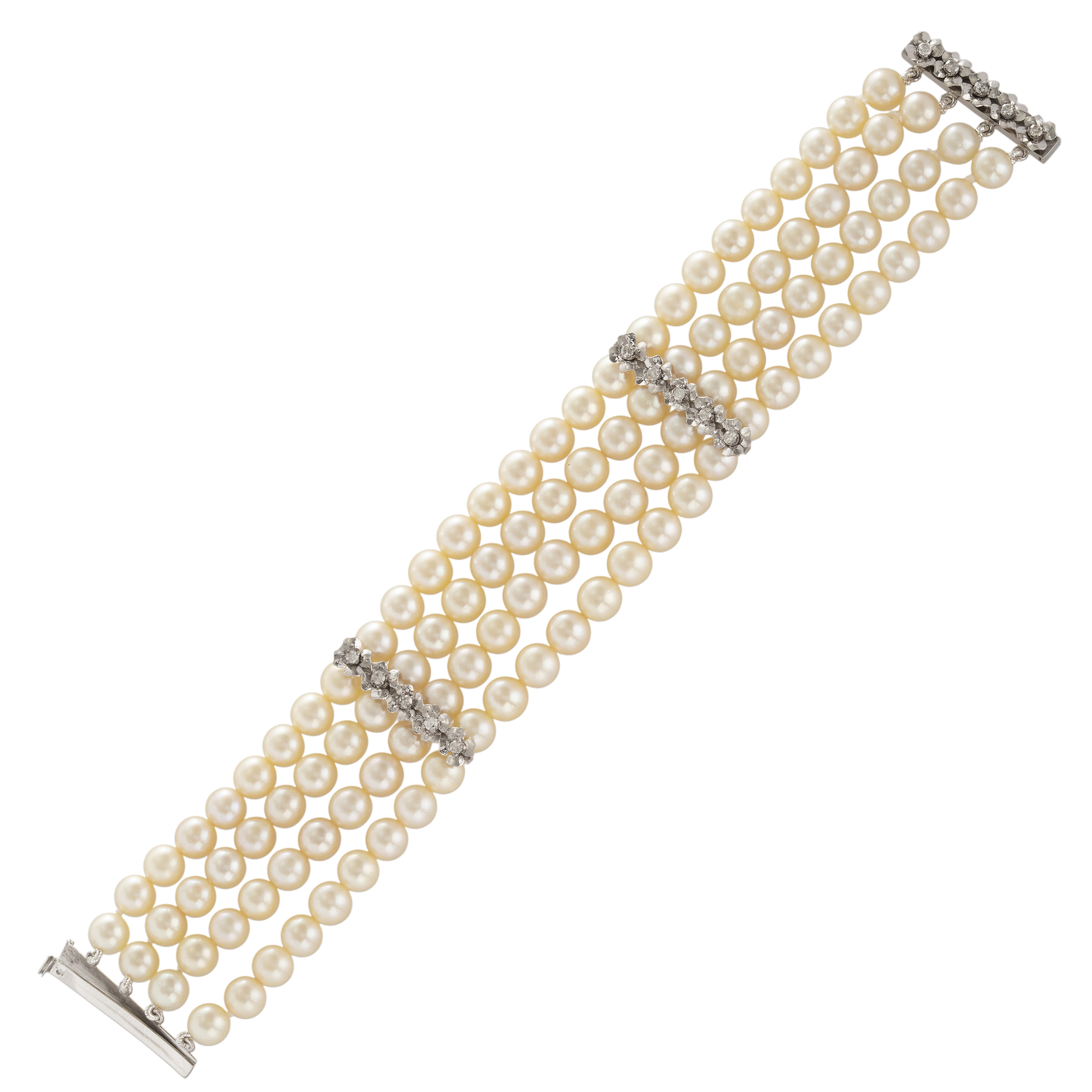 Pulseira de pérolas (6,4mm a 8,9mm) com ouro branco 14k e 0,60ct de brilhantes. Medida 19cm.
