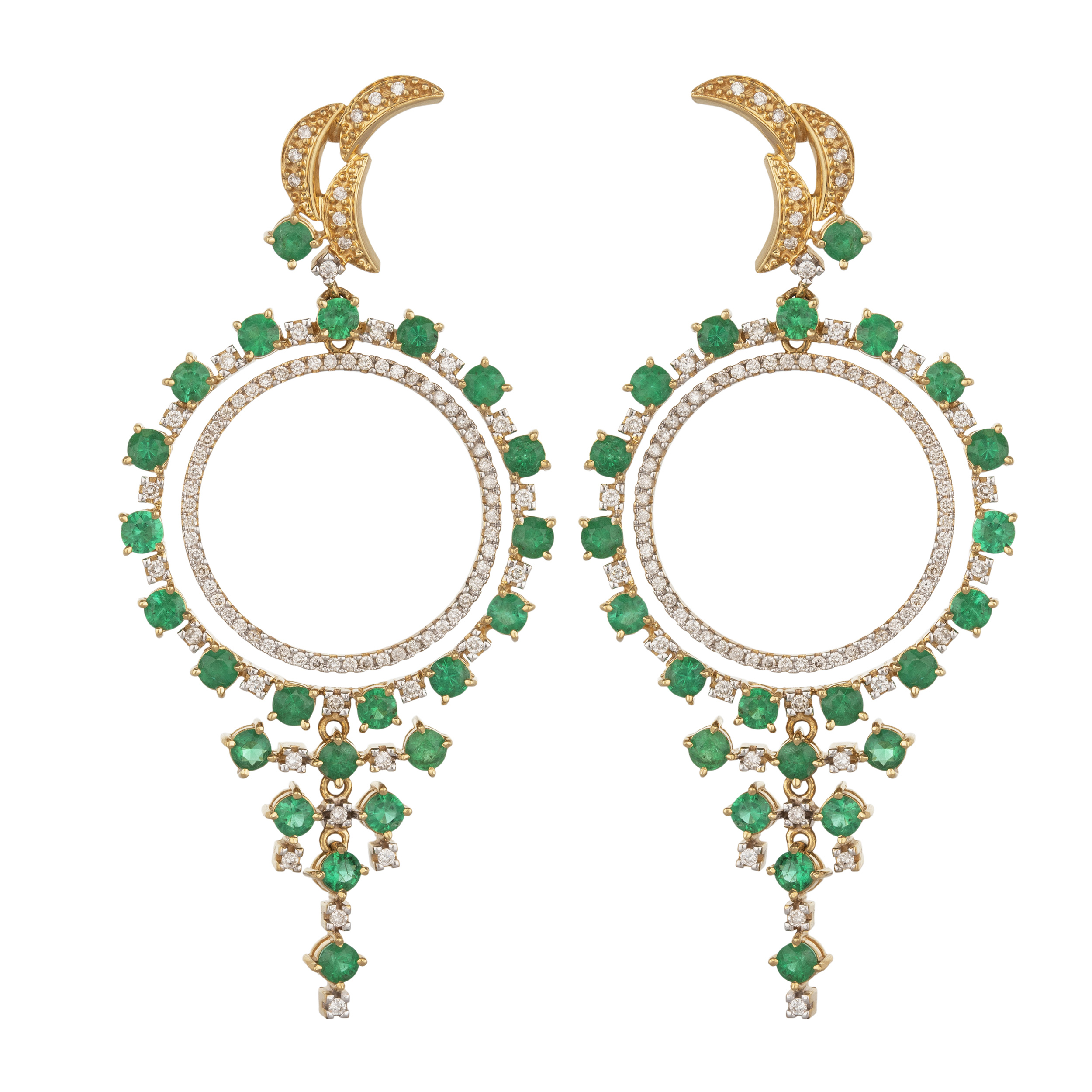 Brinco de ouro amarelo com 4,60ct de esmeraldas, 1,00ct de brilhantes J/VS-SI e 23,4g. Medida 7cm.