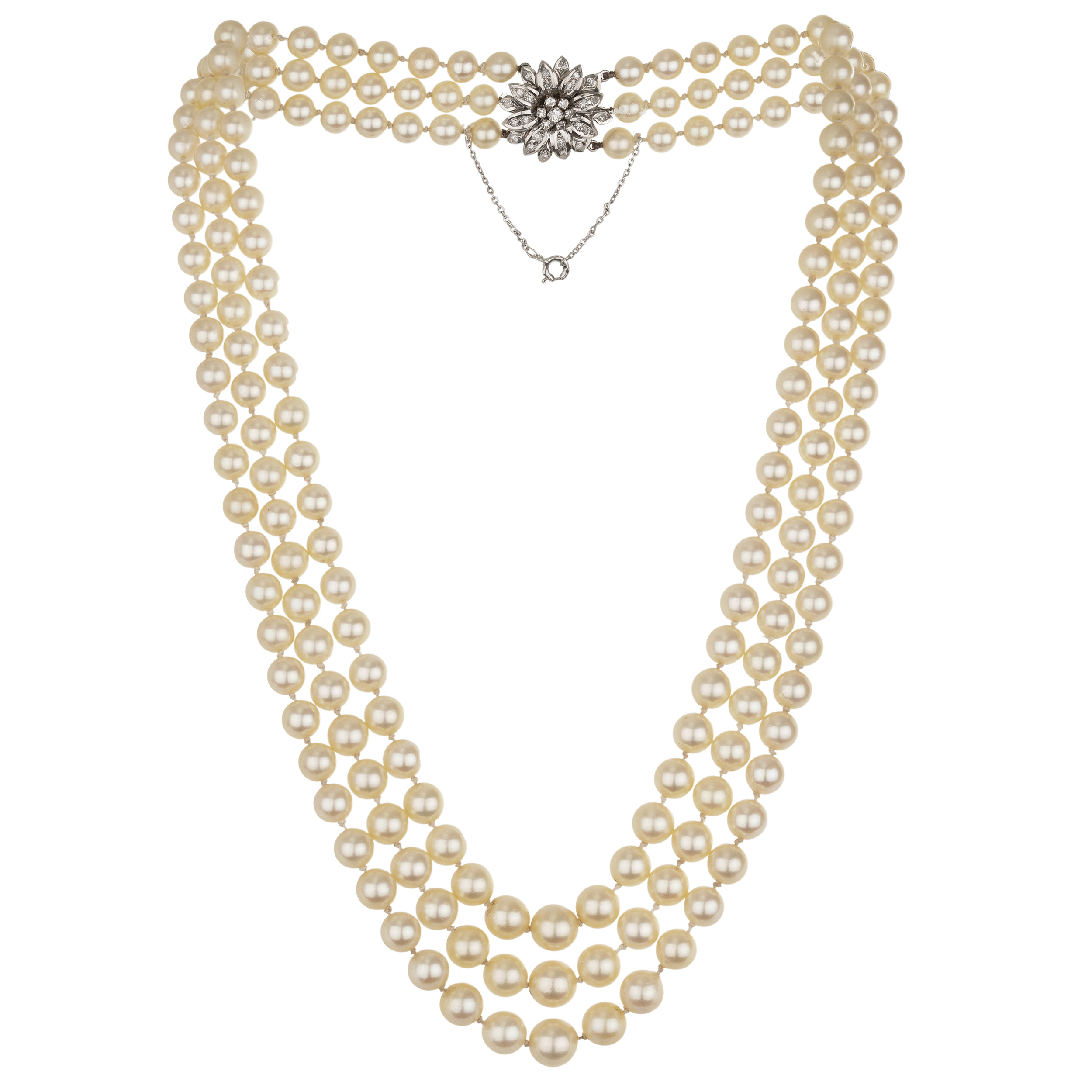 Colar de pérolas (6,3mm a 9,7mm) com ouro branco e 0,85ct de brilhantes. Medida 55cm.