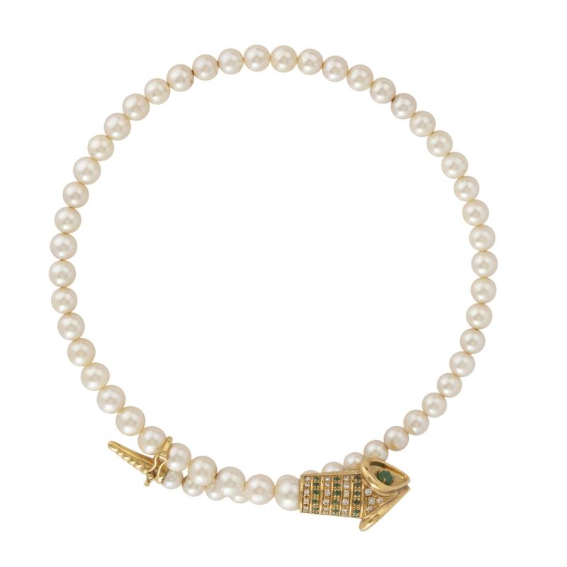 Gargantilha de pérolas (6,6mm a 9,3mm) com ouro amarelo, esmeraldas e 0,60ct de brilhantes. Medida 42cm.
