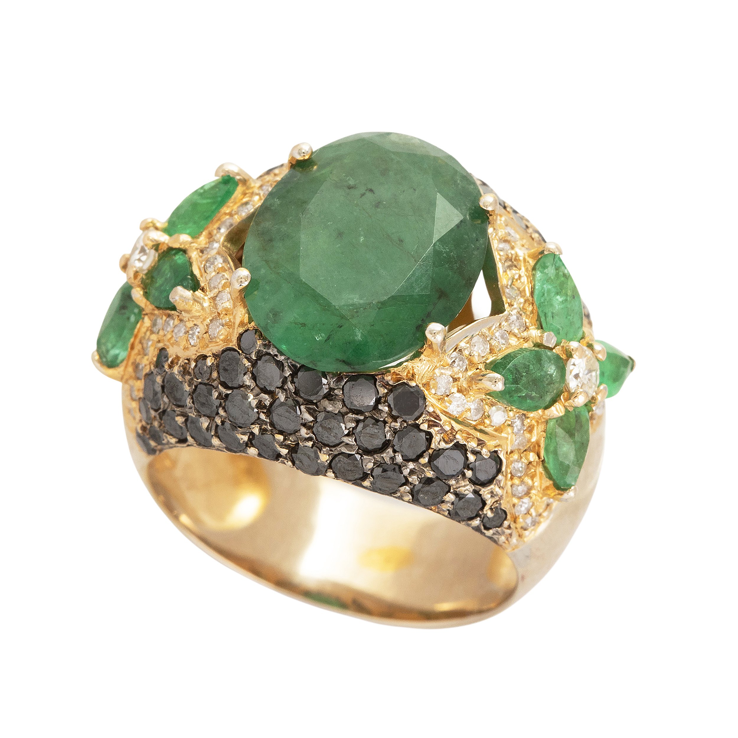 Anel de ouro amarelo com 6,00ct de esmeraldas (sendo 4,40ct a maior), 1,90ct de brilhantes brancos e negros e 14,0g. Medida 19.