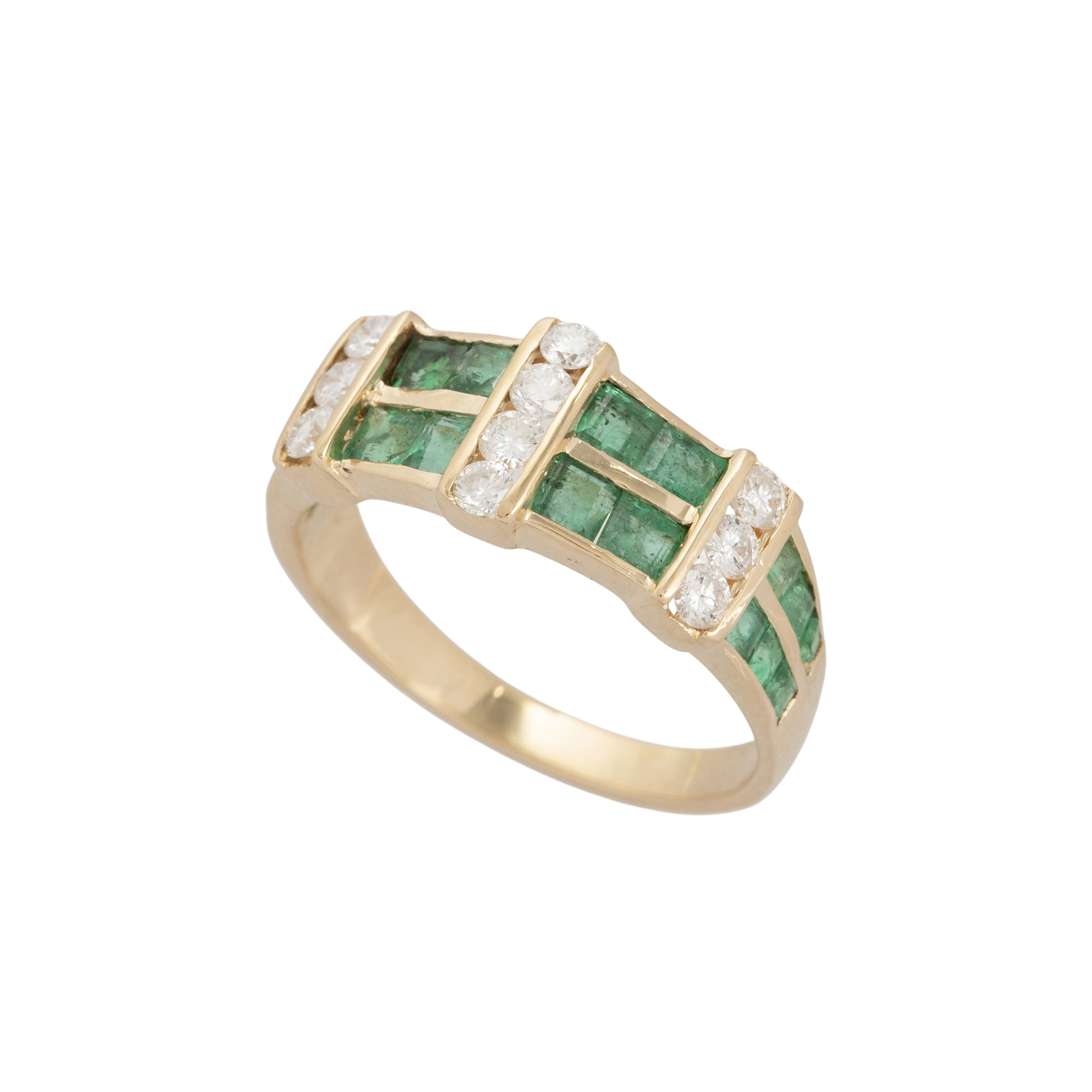 Anel de ouro amarelo com esmeraldas e 0,50ct de brilhantes. Medida 15.