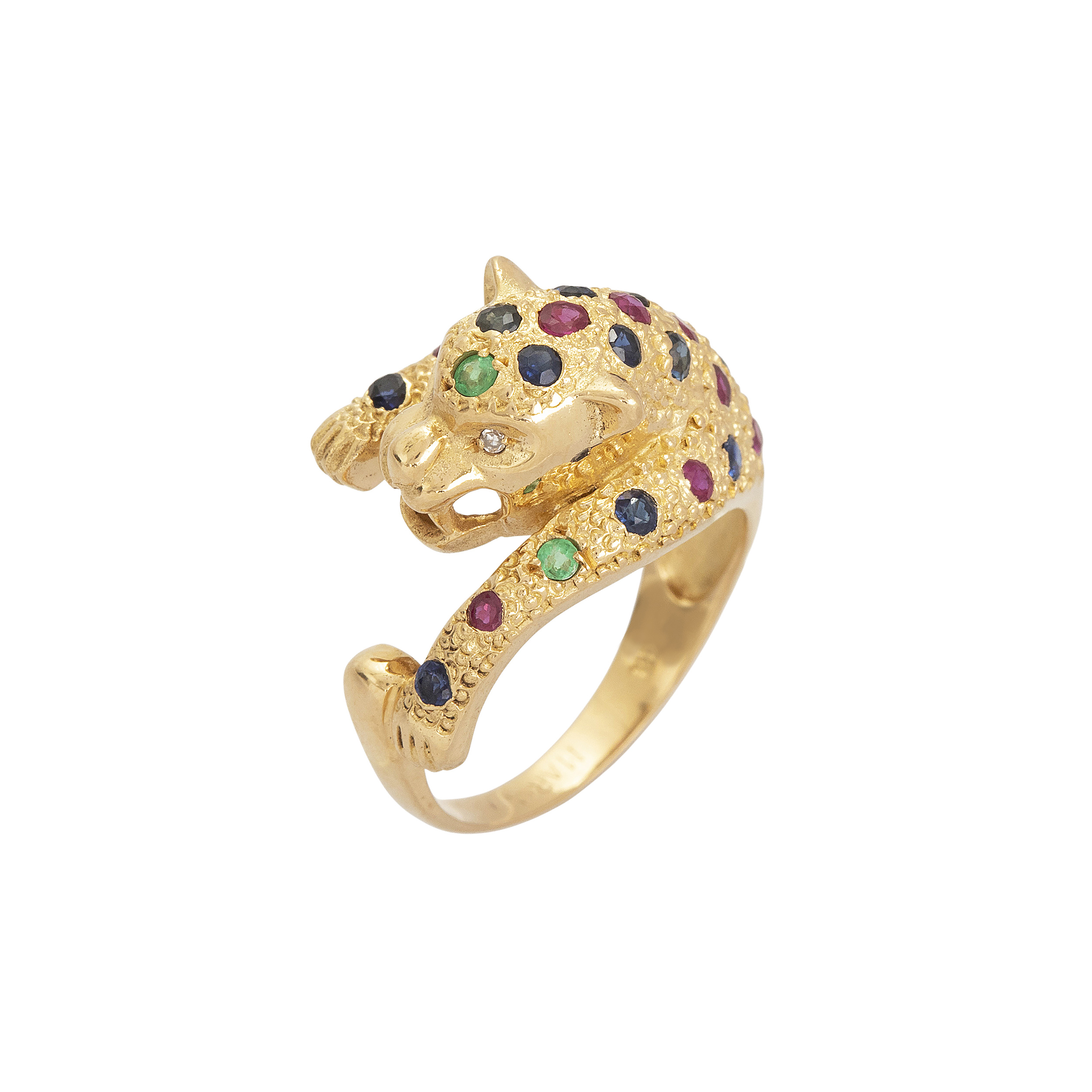 Anel de ouro amarelo com rubis, safiras, esmeraldas e 0,01ct de brilhantes. Medida 14.