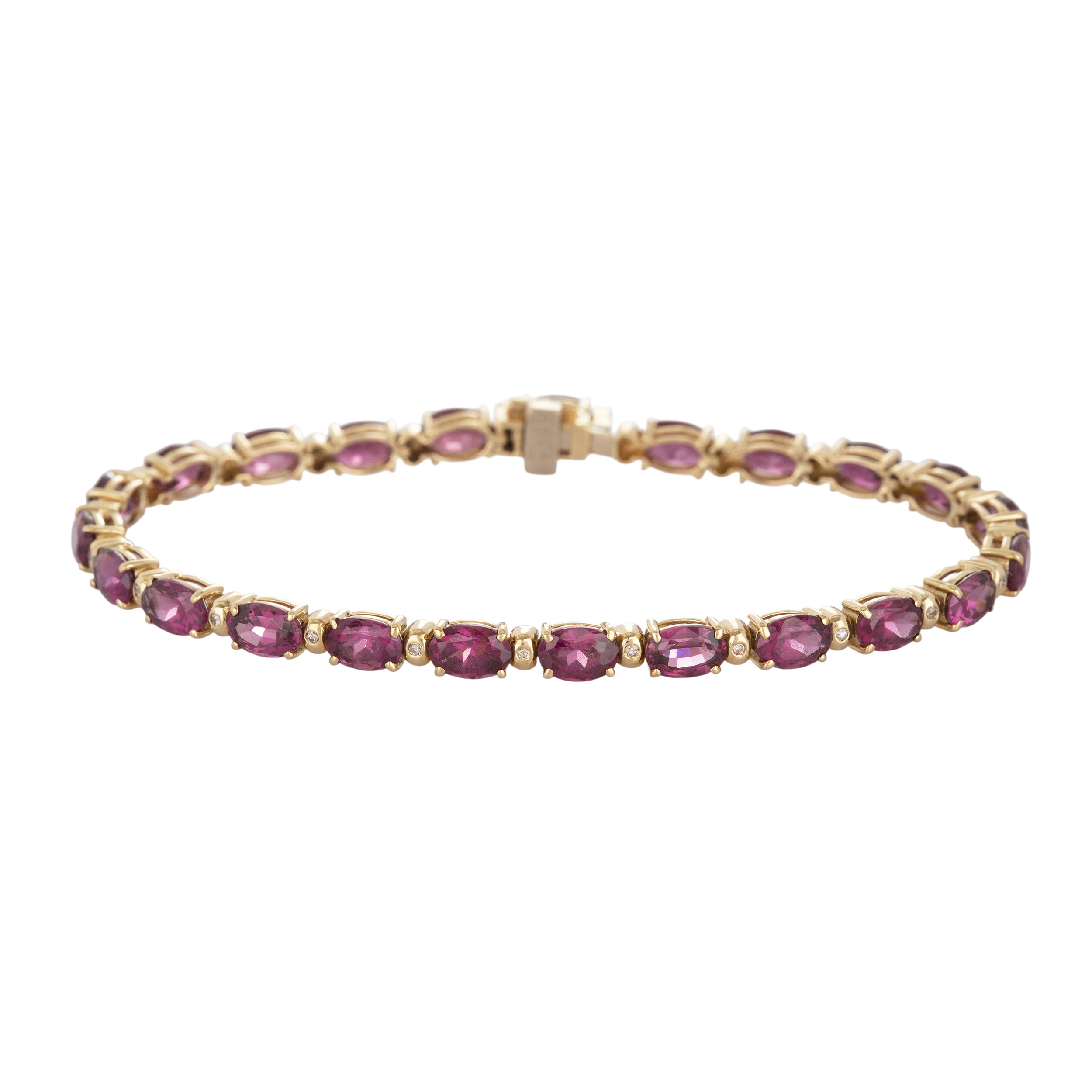 Pulseira de ouro amarelo com 15,23ct de rodolitas, 0,12ct de brilhantes e 12,9g. Medida 18cm.