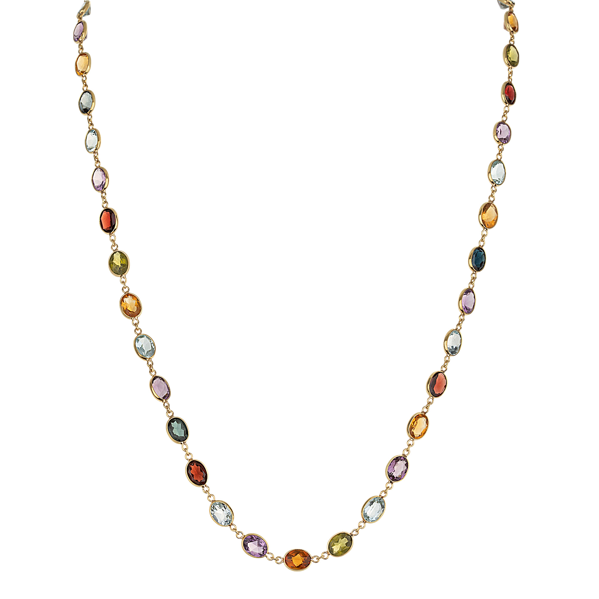 Gargantilha de ouro amarelo com citrinos, ametistas, topázios, peridotos, granadas, turmalinas verdes e azuis e 20,5g. Medida 60cm.