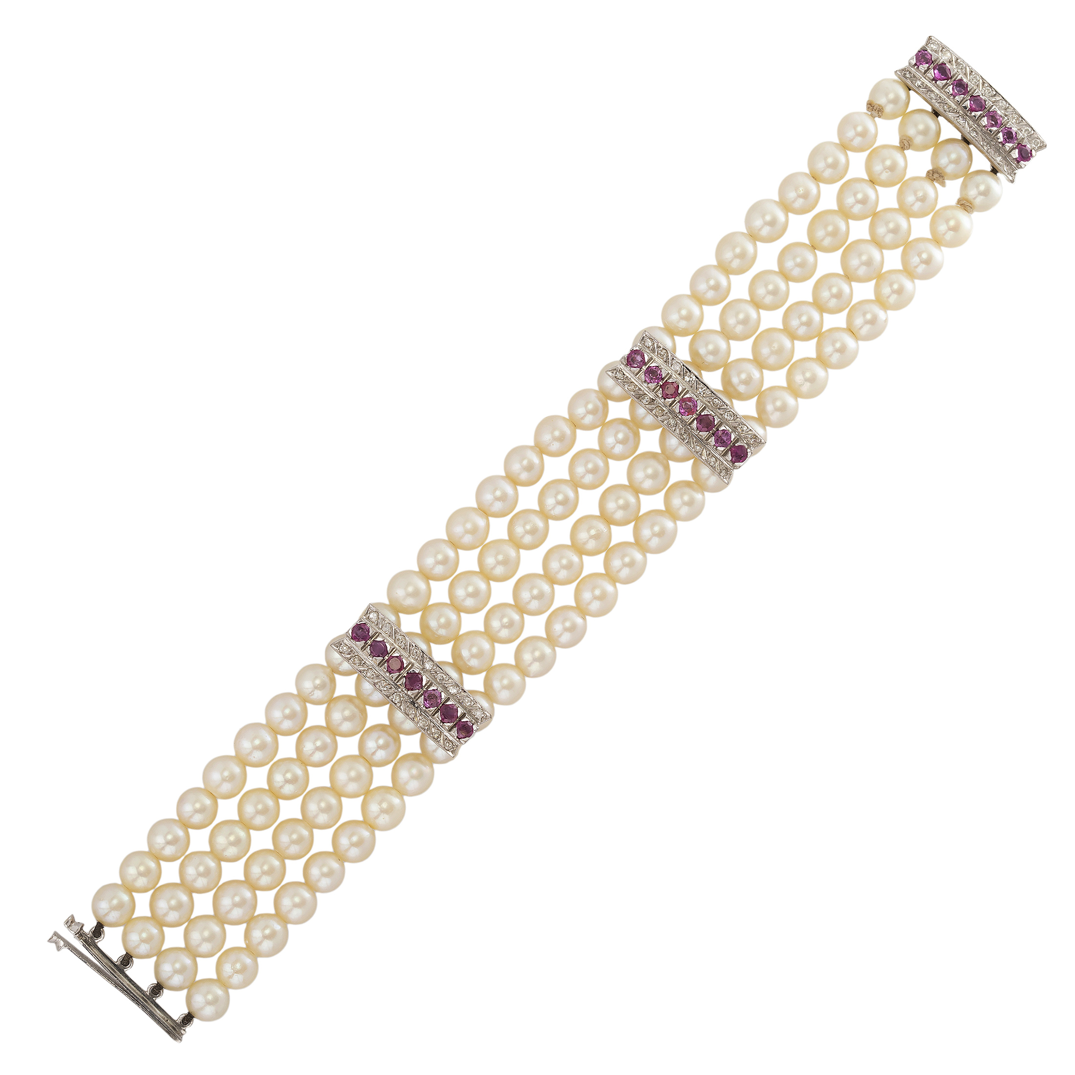Pulseira de pérolas (6mm) com platina, safiras rosa e 0,80ct de brilhantes. Medida 19,5cm.