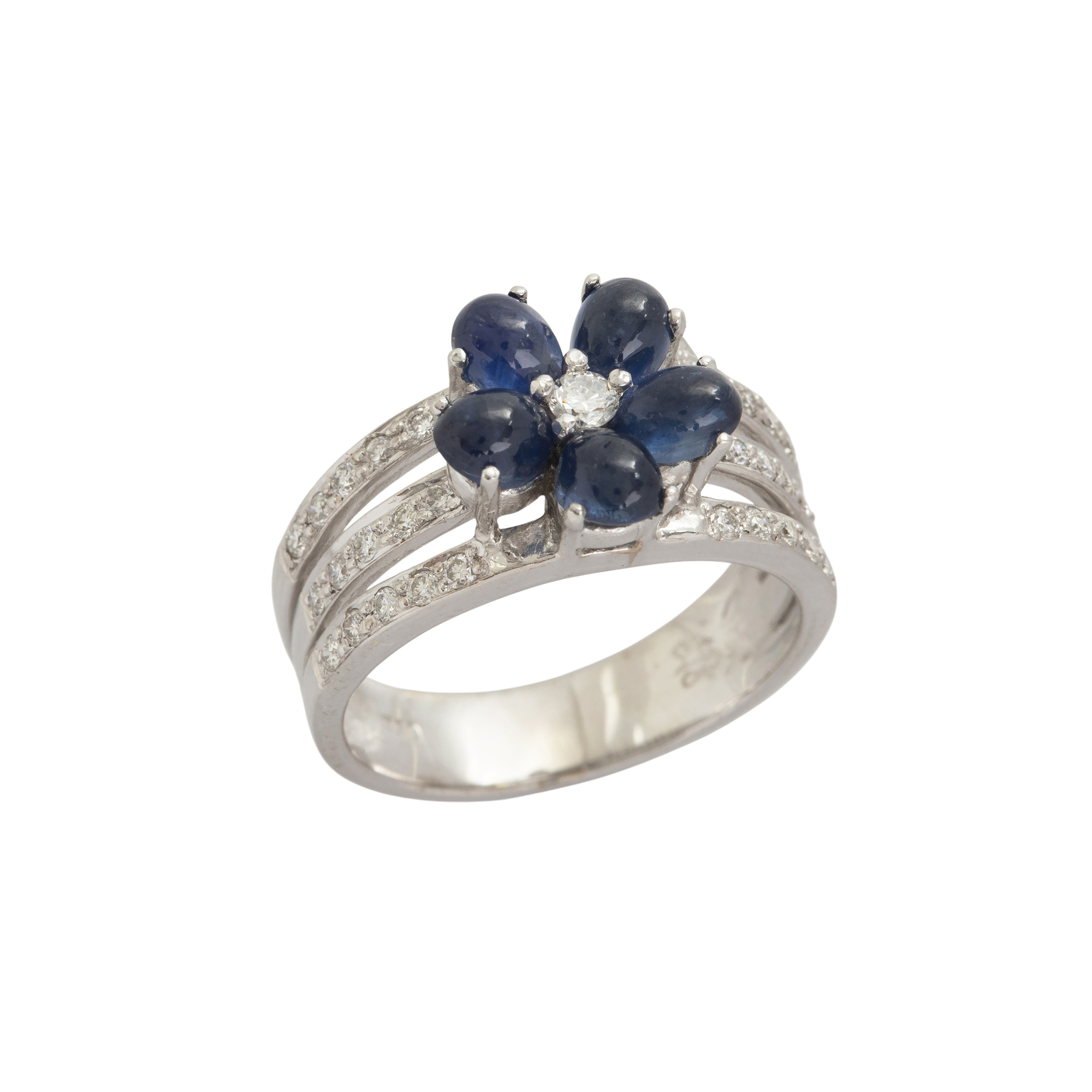 Anel de ouro branco com safiras, 0,45ct de brilhantes e 6,8g. Medida 16.