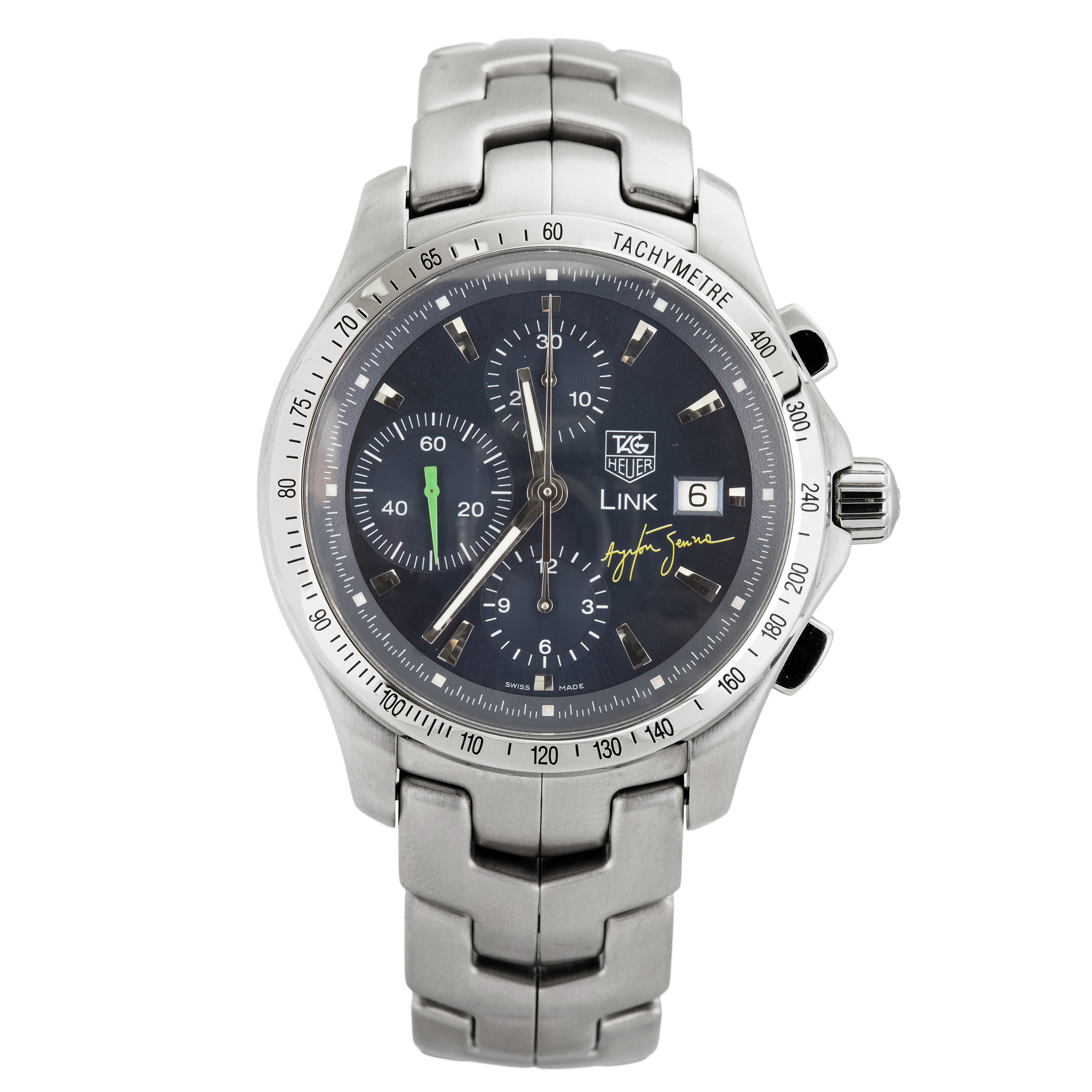 TAG HEUER. Relógio Link Edição Limitada Ayrton Senna de aço com movimento automático, cronógrafo, calendário, vidro de safira, anos 2000. Caixa 42mm. Pulseira 20cm.