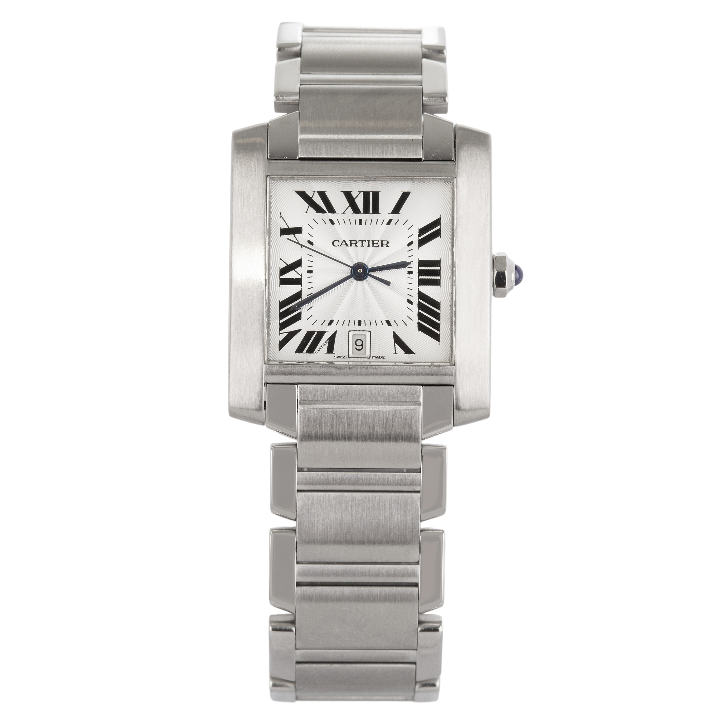 CARTIER. Relógio Tank Francês de aço com movimento automático, calendário, vidro de safira, anos 2000. Com estojo original. Caixa 28x32mm. Pulseira 19cm.