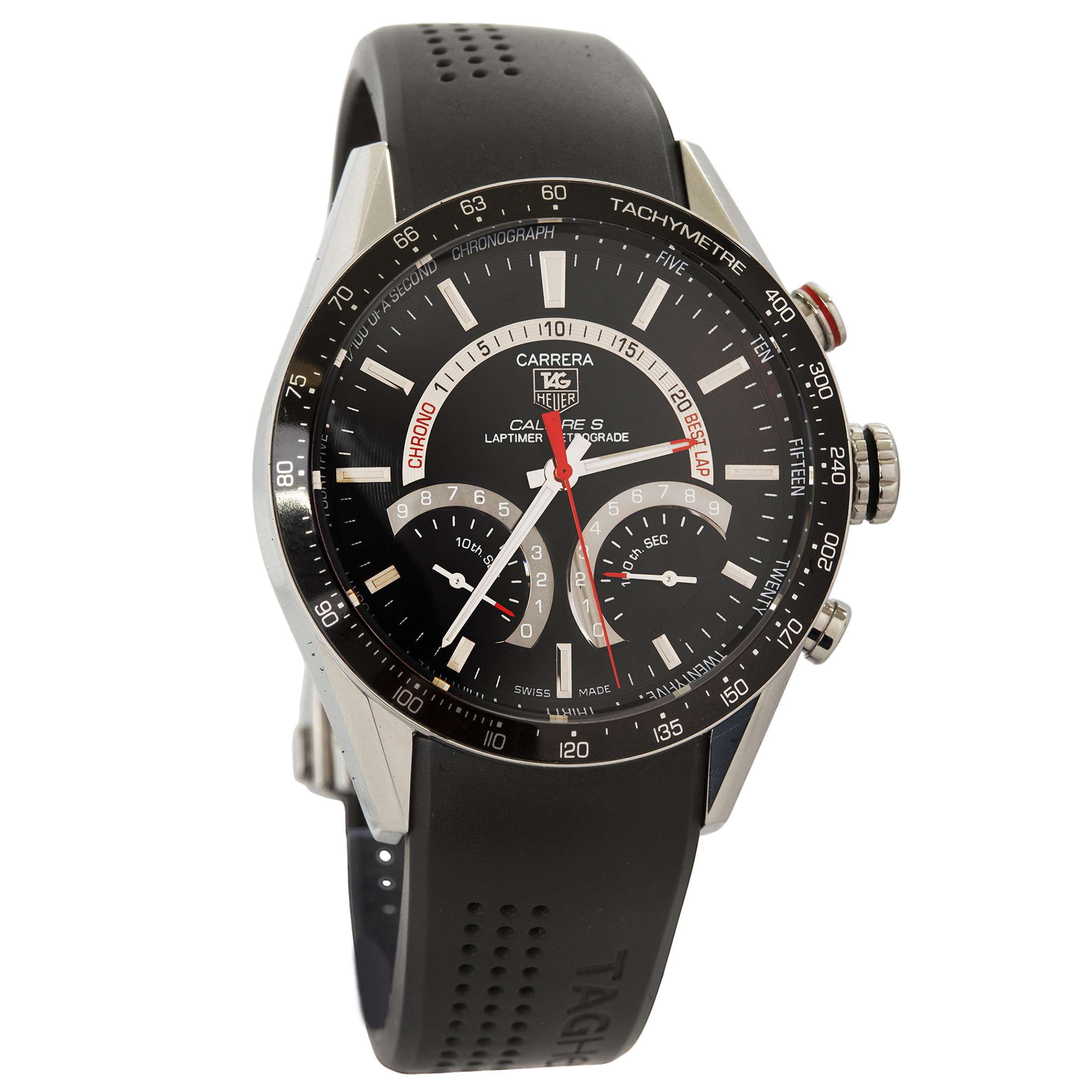 TAG HEUER. Relógio Carrera Calibre S de aço com movimento a quartzo, cronógrafo, vidro de safira, ano 2009. Com estojo e certificado originais. Caixa 43mm. Pulseira de borracha ressecada 20cm.