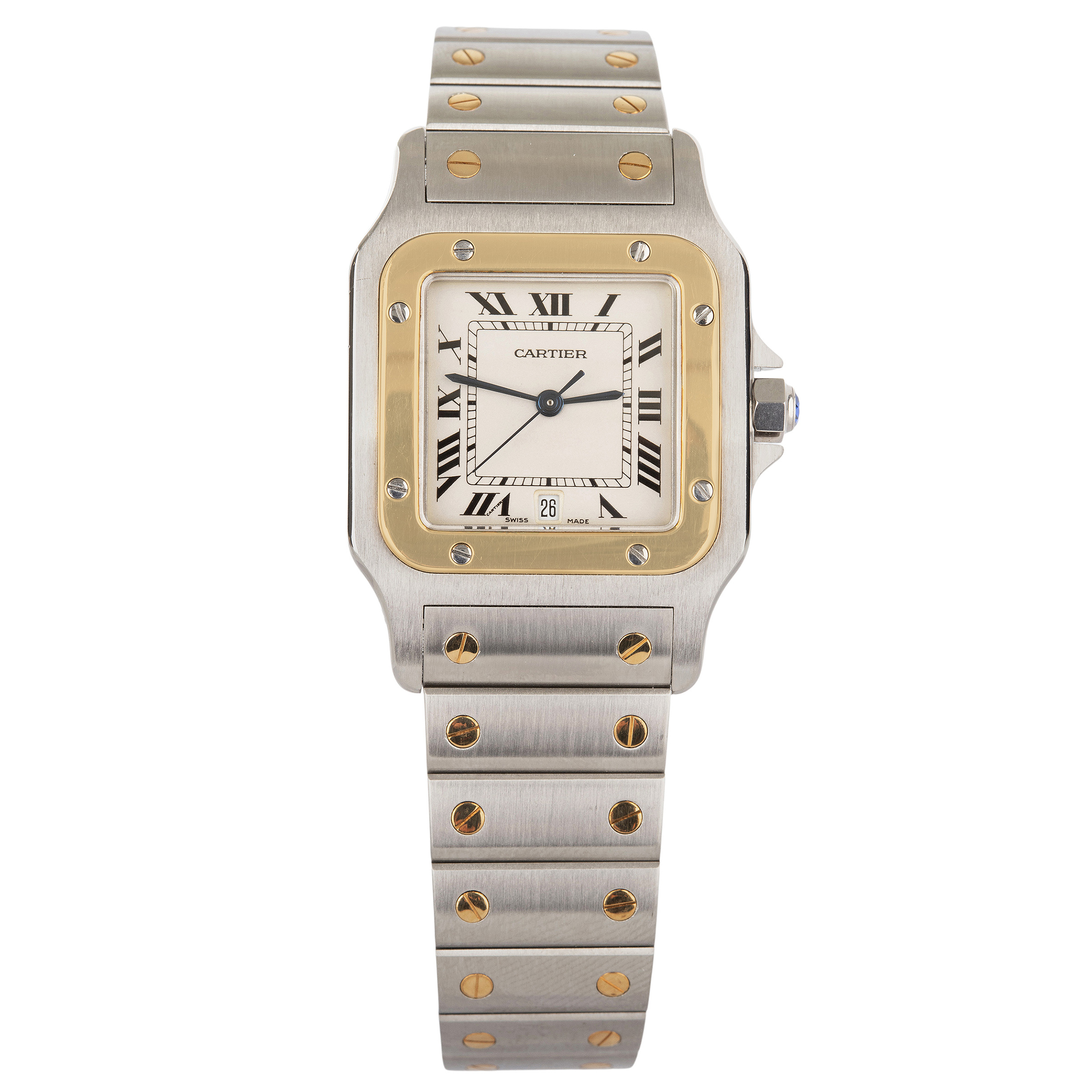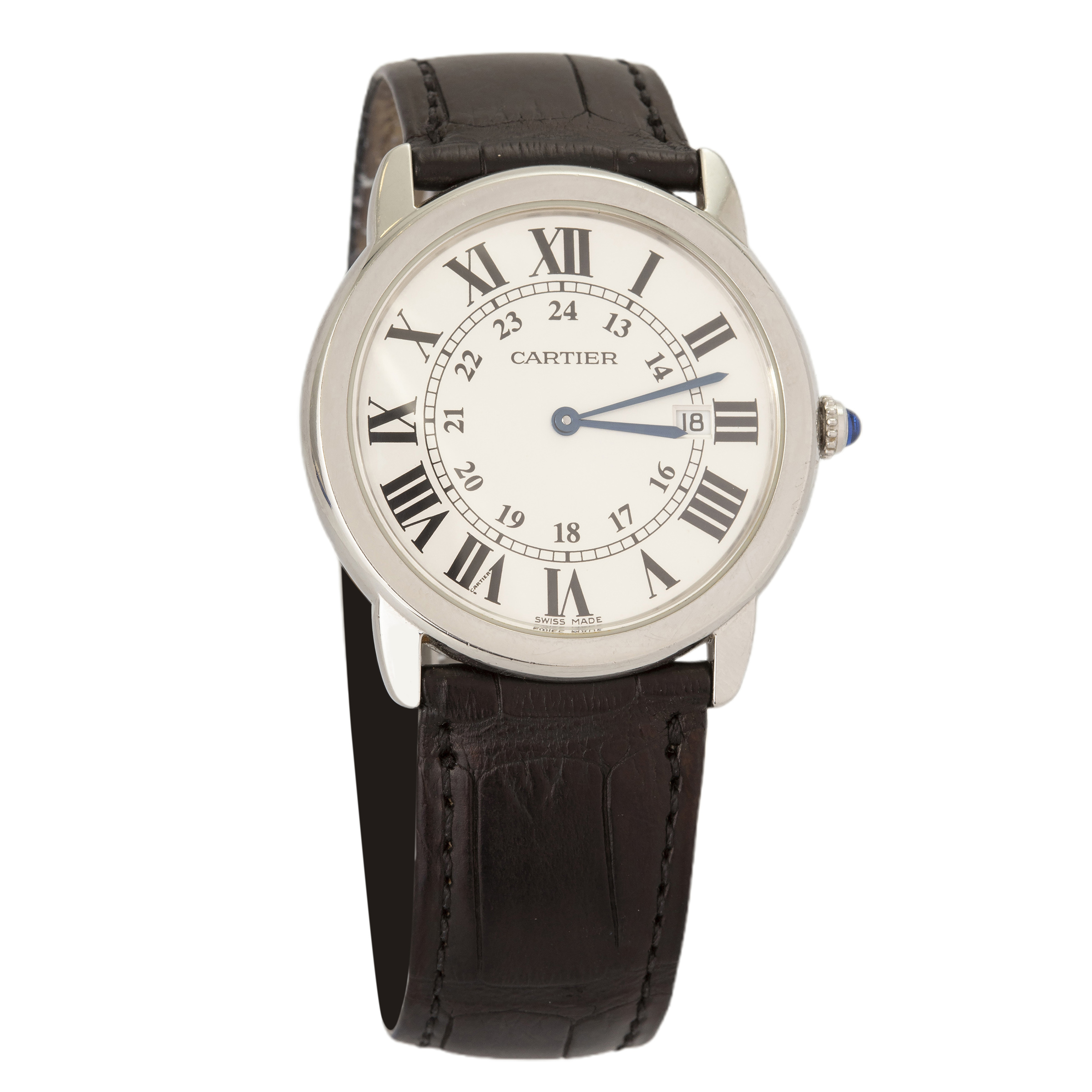 CARTIER. Relógio Ronde Solo de aço com movimento a quartzo, calendário, vidro de safira, ano 2014. Com estojo e certificado originais. Caixa 36mm. Pulseira de couro 22cm.