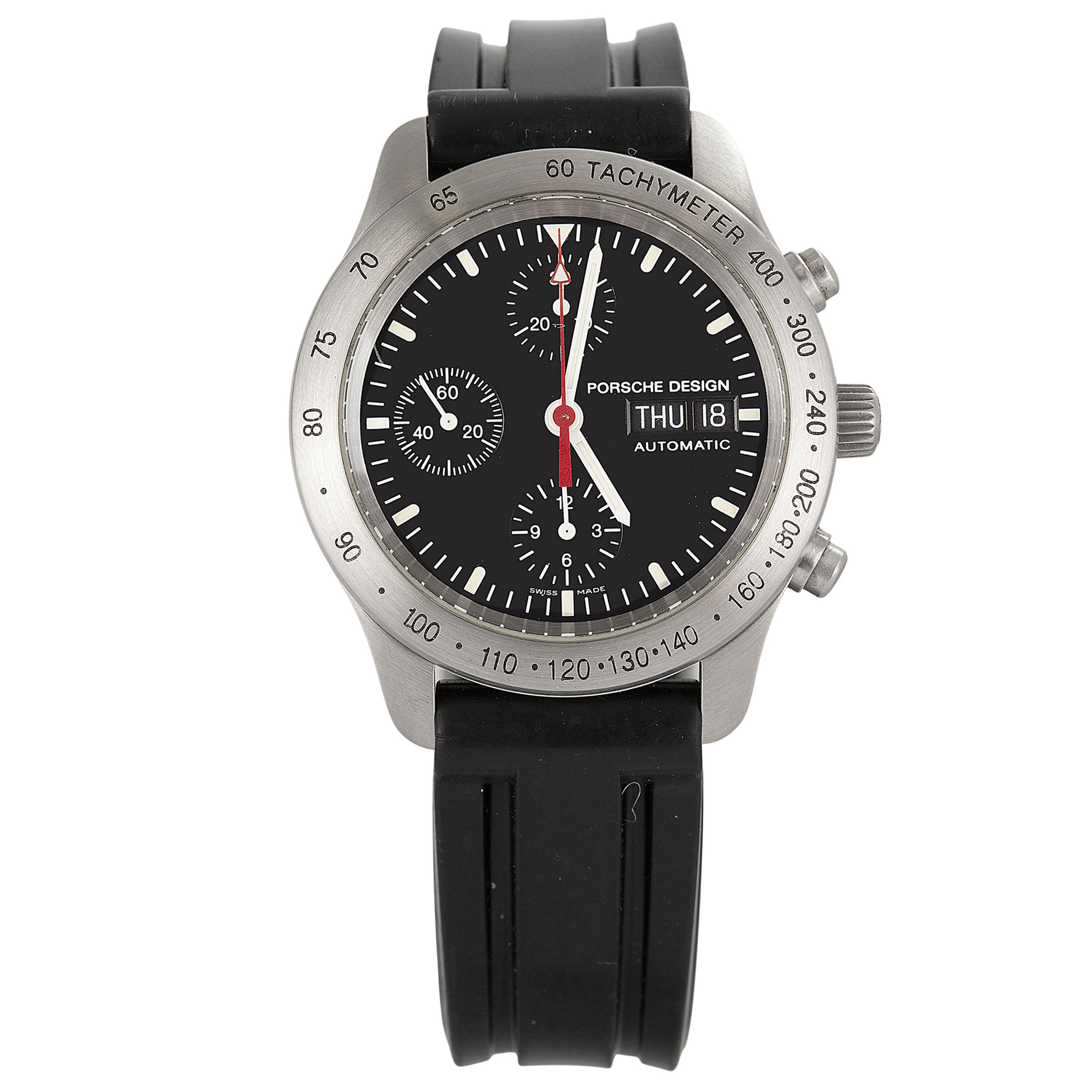 PORSHE DESIGN. Relógio Cronograph Eterna de aço com movimento automático, cronógrafo, calendário, vidro de safira, anos 90. Caixa 39,5mm. Pulseira de borracha não original 22cm.