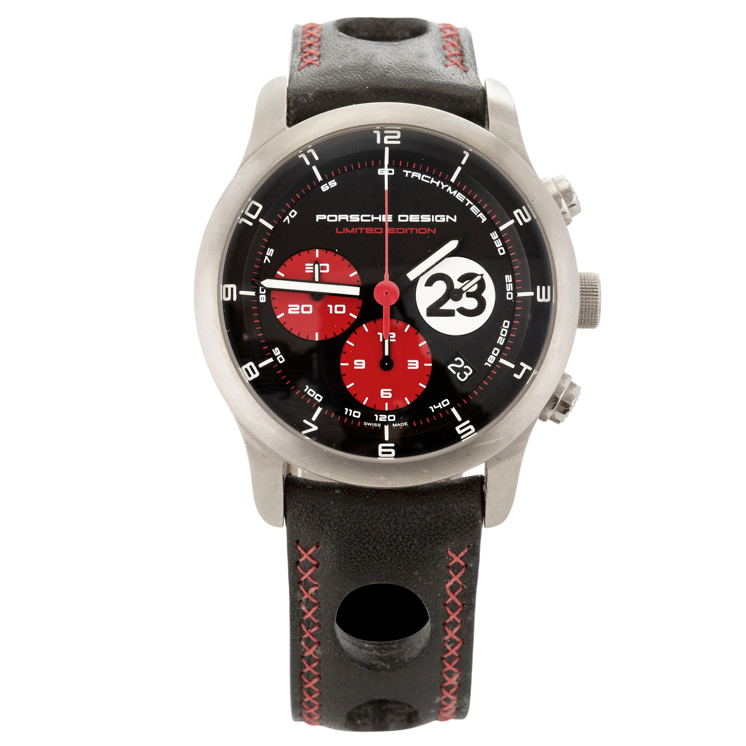 PORSHE DESIGN. Relógio Le Mans 1970 de titânio com movimento automático, cronógrafo, calendário, vidro de safira, ano 2016. Com certificado original. Caixa 42mm. Pulseira de couro 22cm.