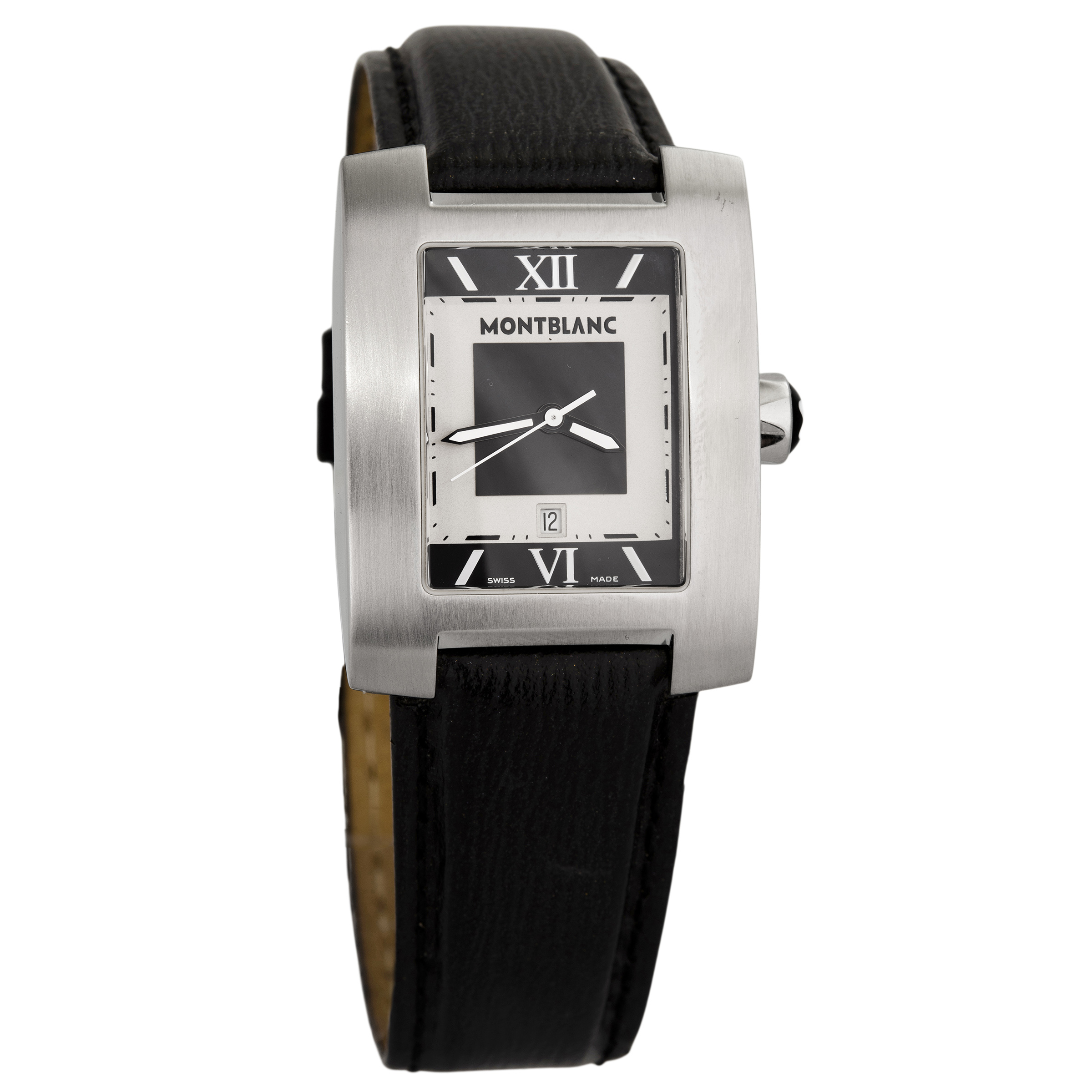 MONTBLANC. Relógio Profile de aço com movimento a quartzo, calendário, vidro de safira, anos 2000. Caixa 29x37mm. Pulseira de couro 20cm.