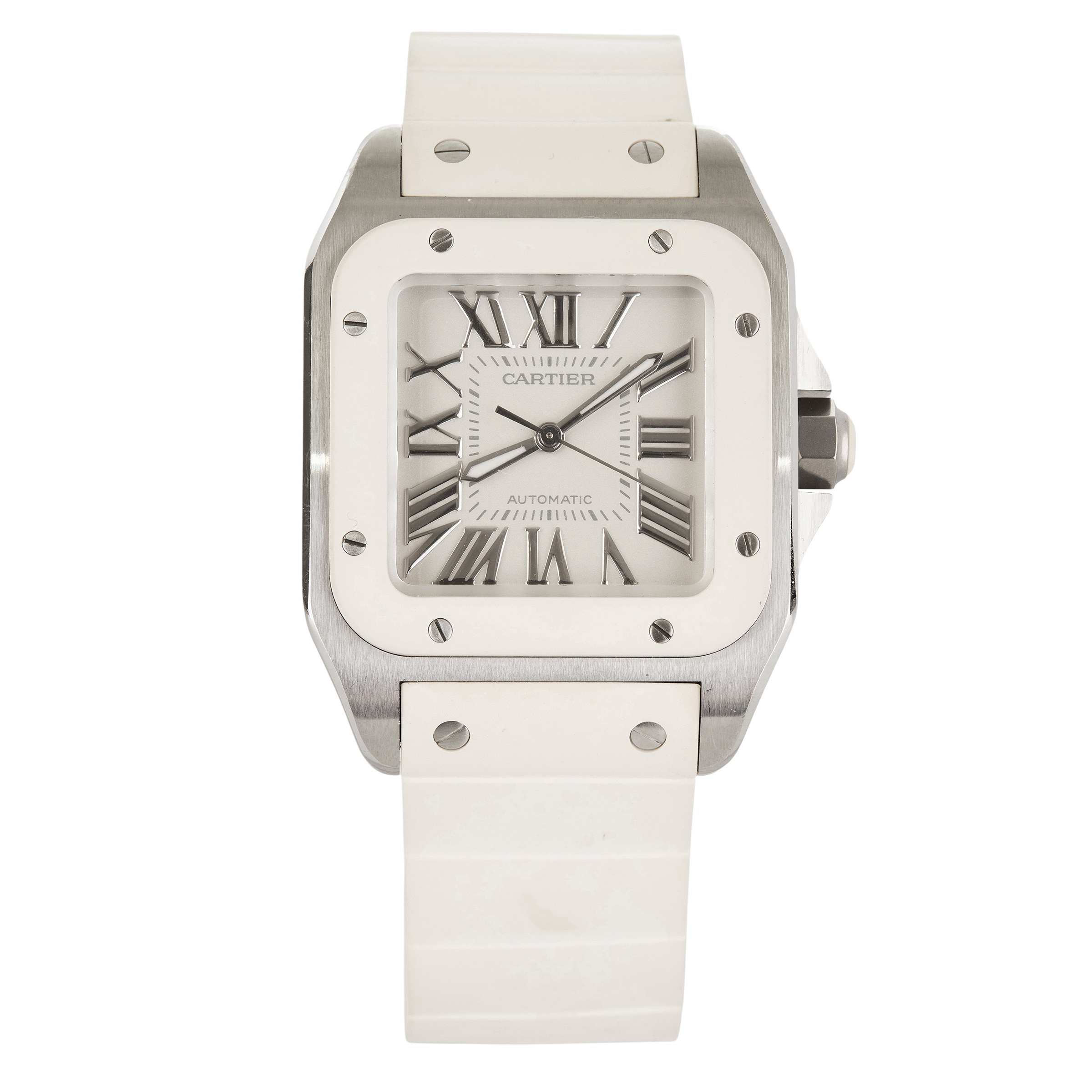 CARTIER. Relógio Santos 100 de aço com aro de borracha, movimento automático, calendário, vidro de safira, anos 2000. Caixa 33x44mm. Pulseira de borracha 18cm.