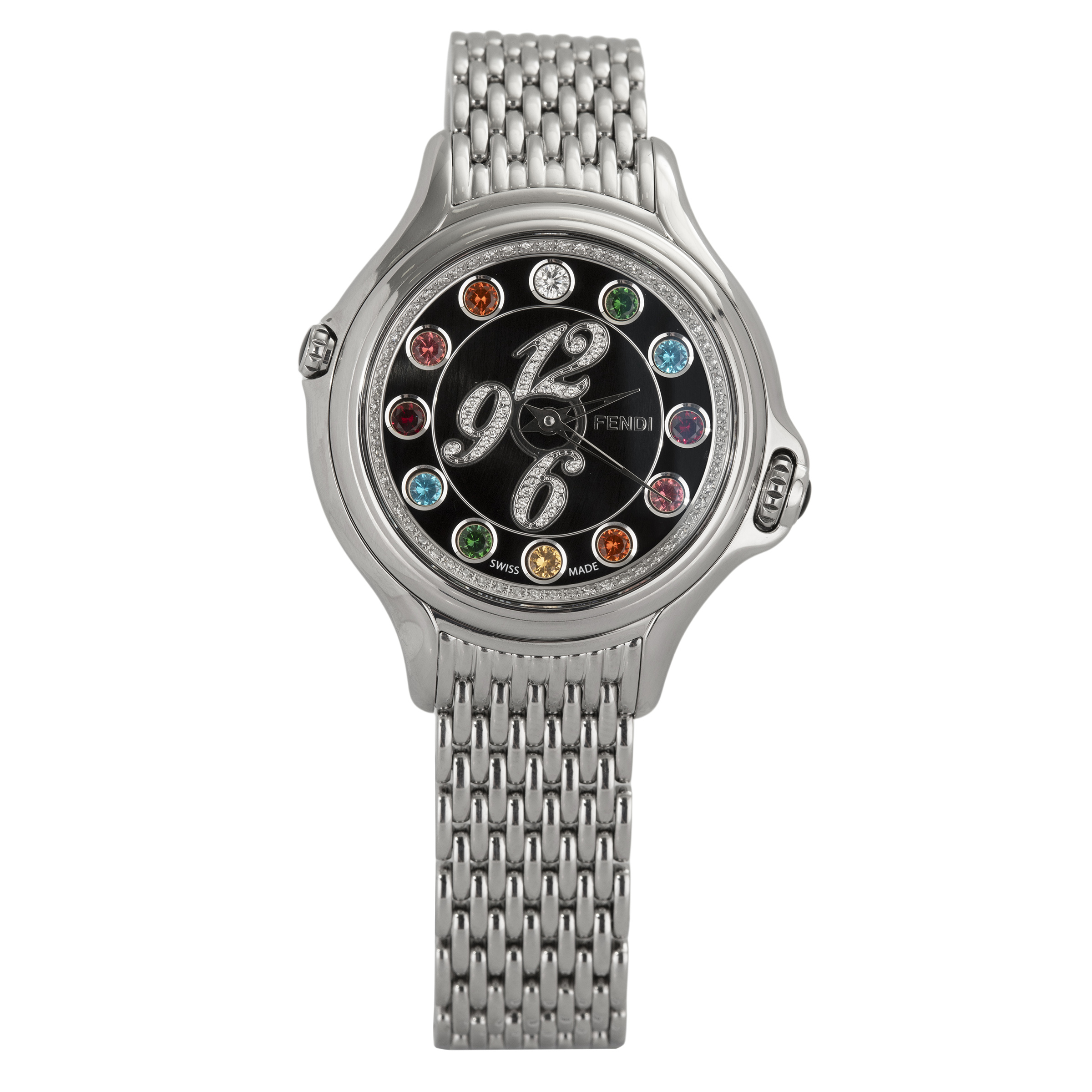 FENDI. Relógio Crazy Carats de aço com pedras coloridas, 0,58ct de brilhantes, movimento a quartzo, vidro de cristal mineral, anos 2000. Caixa 38mm. Pulseira 17cm.