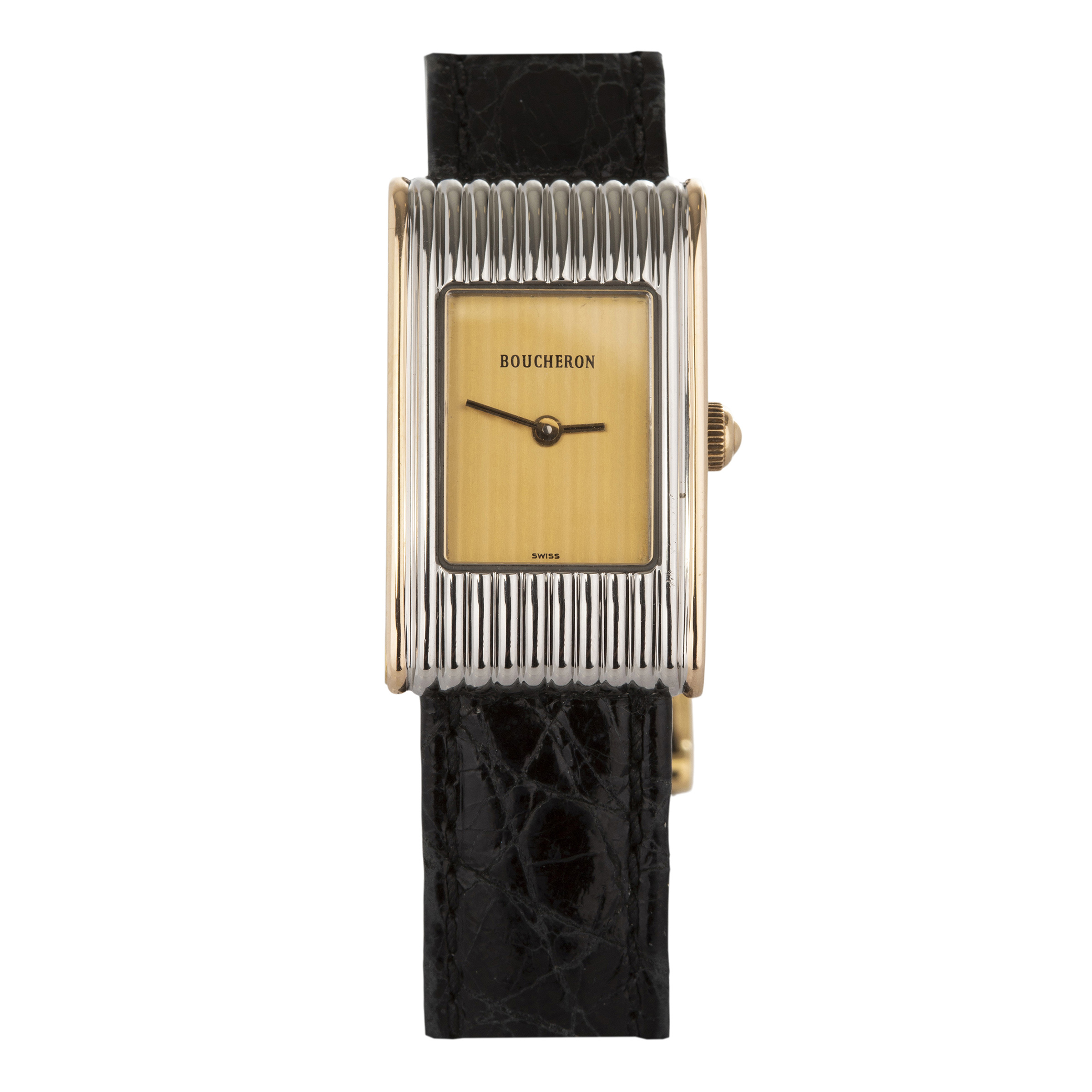 BOUCHERON. Relógio Reflete de aço e ouro amarelo com movimento a quartzo, vidro de safira, anos 2000. Com estojo original. Caixa 18x29mm. Pulseira de couro 17cm.