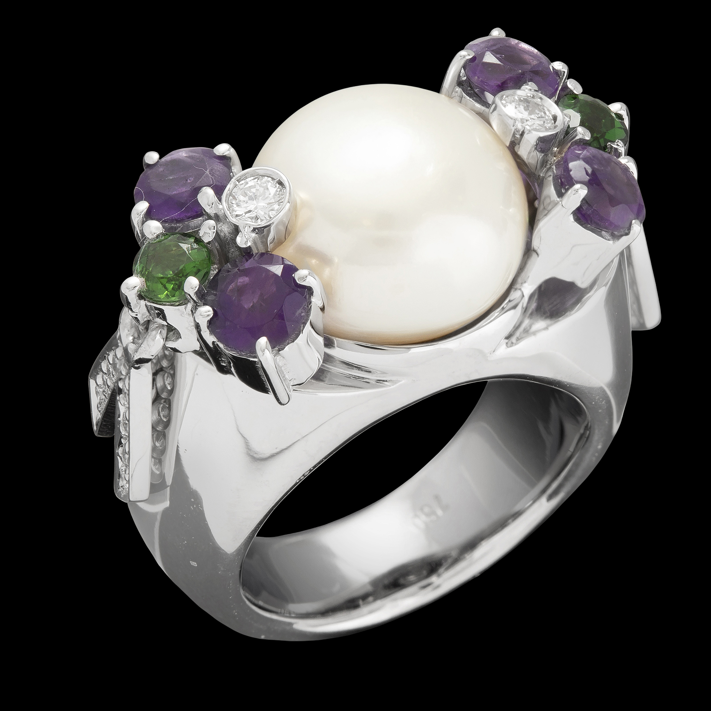 RUTH GRIECO. Anel de ouro branco com pérola (12,3mm), turmalinas verdes, ametistas, 0,24ct de brilhantes e 16,8g. Medida 14
