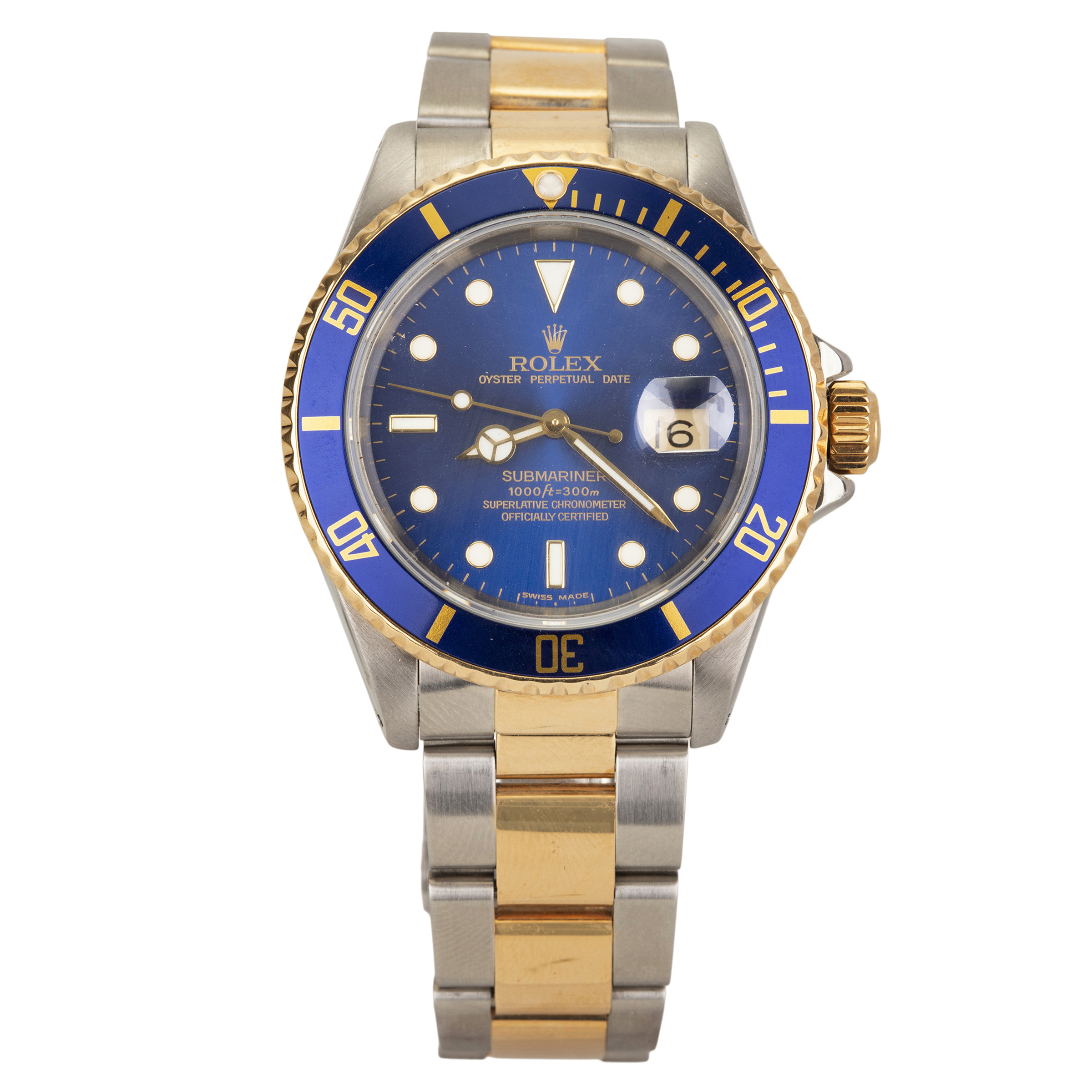 ROLEX. Relógio Submariner de aço e ouro amarelo com movimento automático, calendário, vidro de safira, ano 1991. Caixa 40mm. Pulseira oyster 20cm.