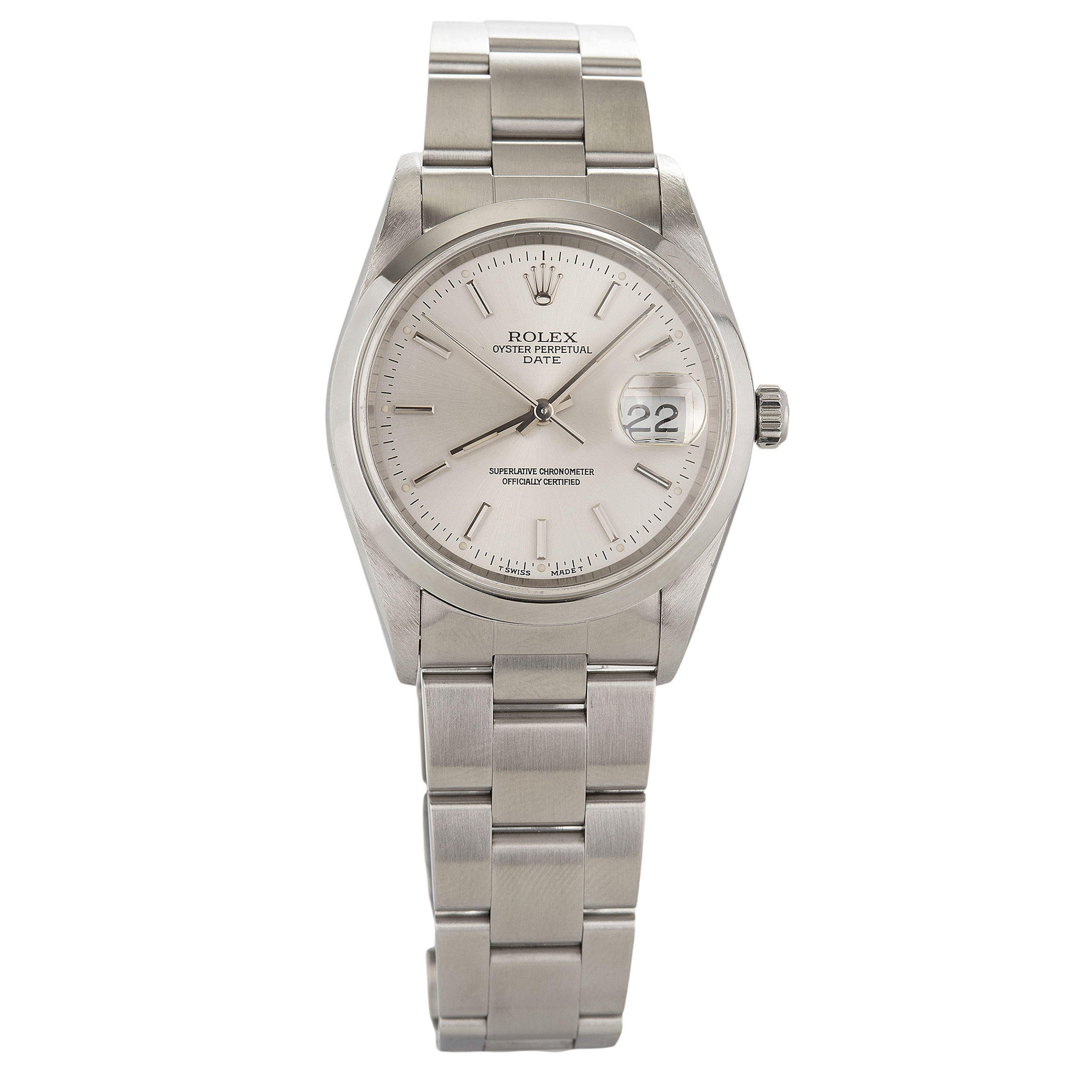 ROLEX. Relógio Date de aço com movimento automático, calendário, vidro de safira, ano 1997. Com estojo original. Caixa 34mm. Pulseira oyster 18cm.