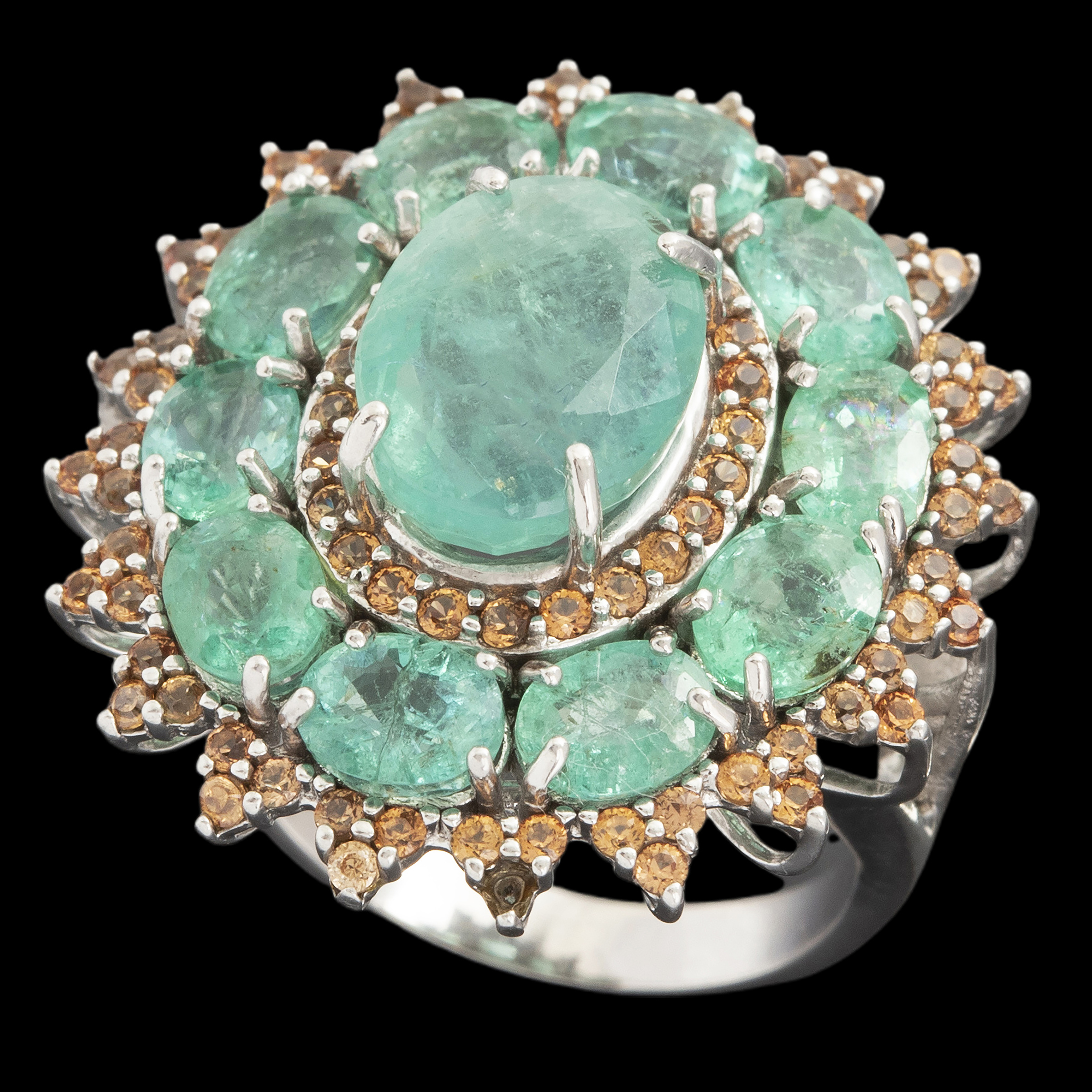 Anel de ouro branco e prata 925 com 5,60ct de esmeraldas, citrinos e 7,3g. Medida 16.