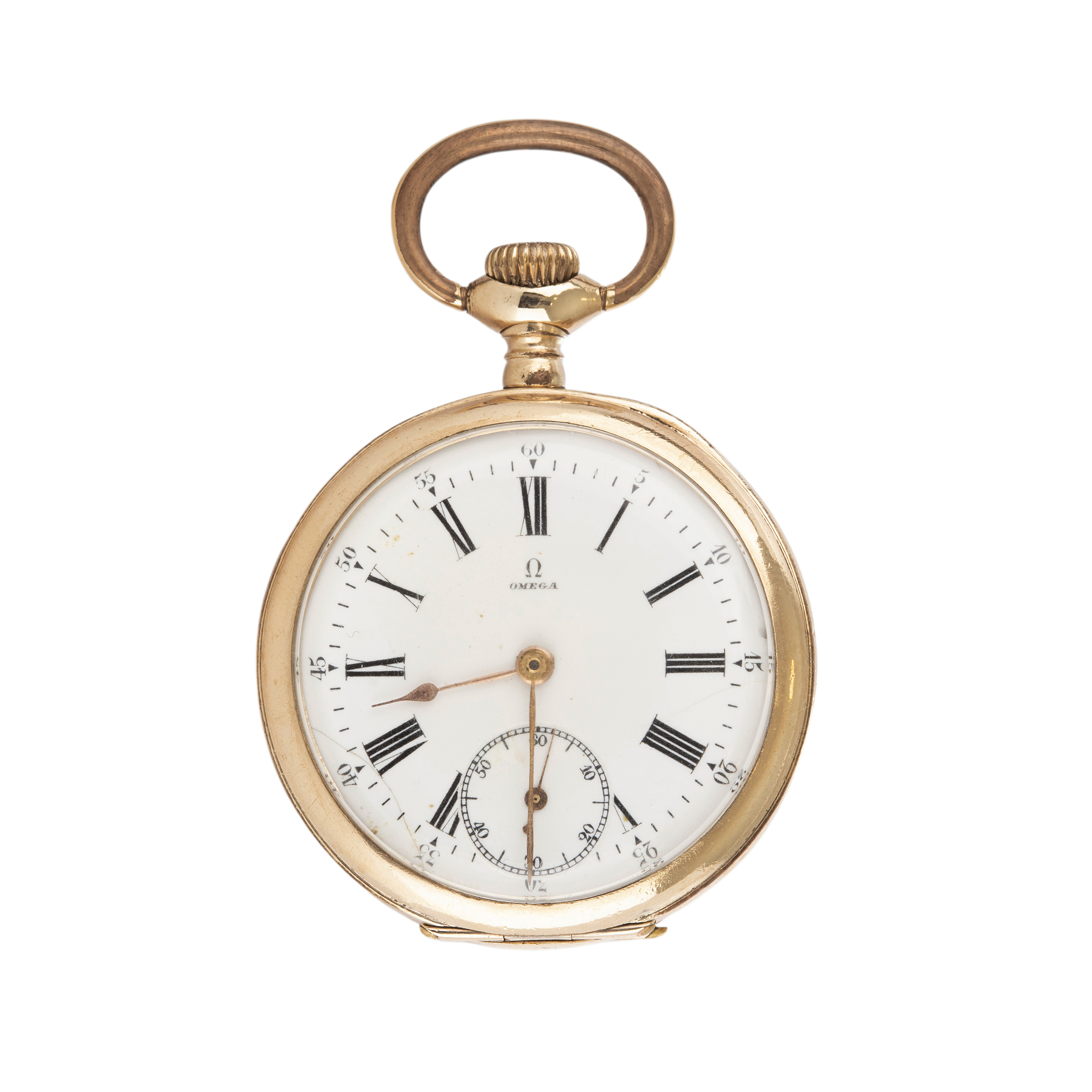 OMEGA. Relógio de bolso com plaqué de ouro amarelo, alça com desgaste, mostrador de porcelana com detalhe, corda manual, vidro de cristal mineral, anos 60. Caixa 39mm.