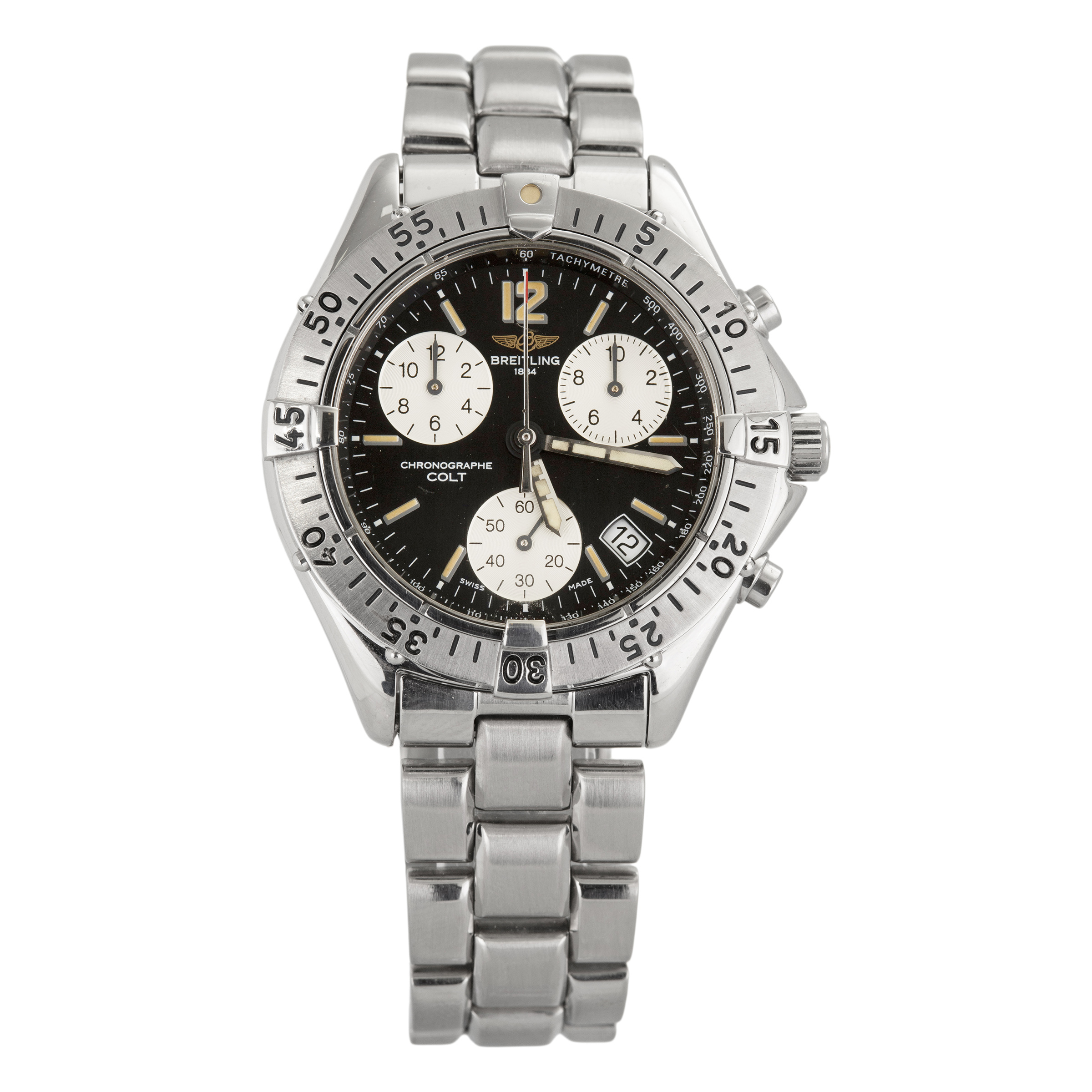 BREITLING. Relógio Colt de aço com movimento a quartzo, cronógrafo, calendário, vidro de safira, anos 90. Caixa 38mm. Pulseira 19cm.