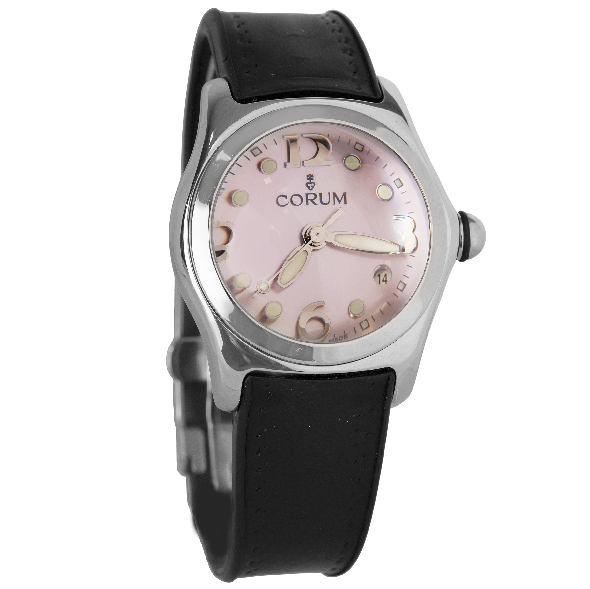 CORUM. Relógio Bubble de aço com movimento a quartzo, calendário, vidro de cristal mineral, anos 2000. Caixa 35mm. Pulseira de borracha 18cm.