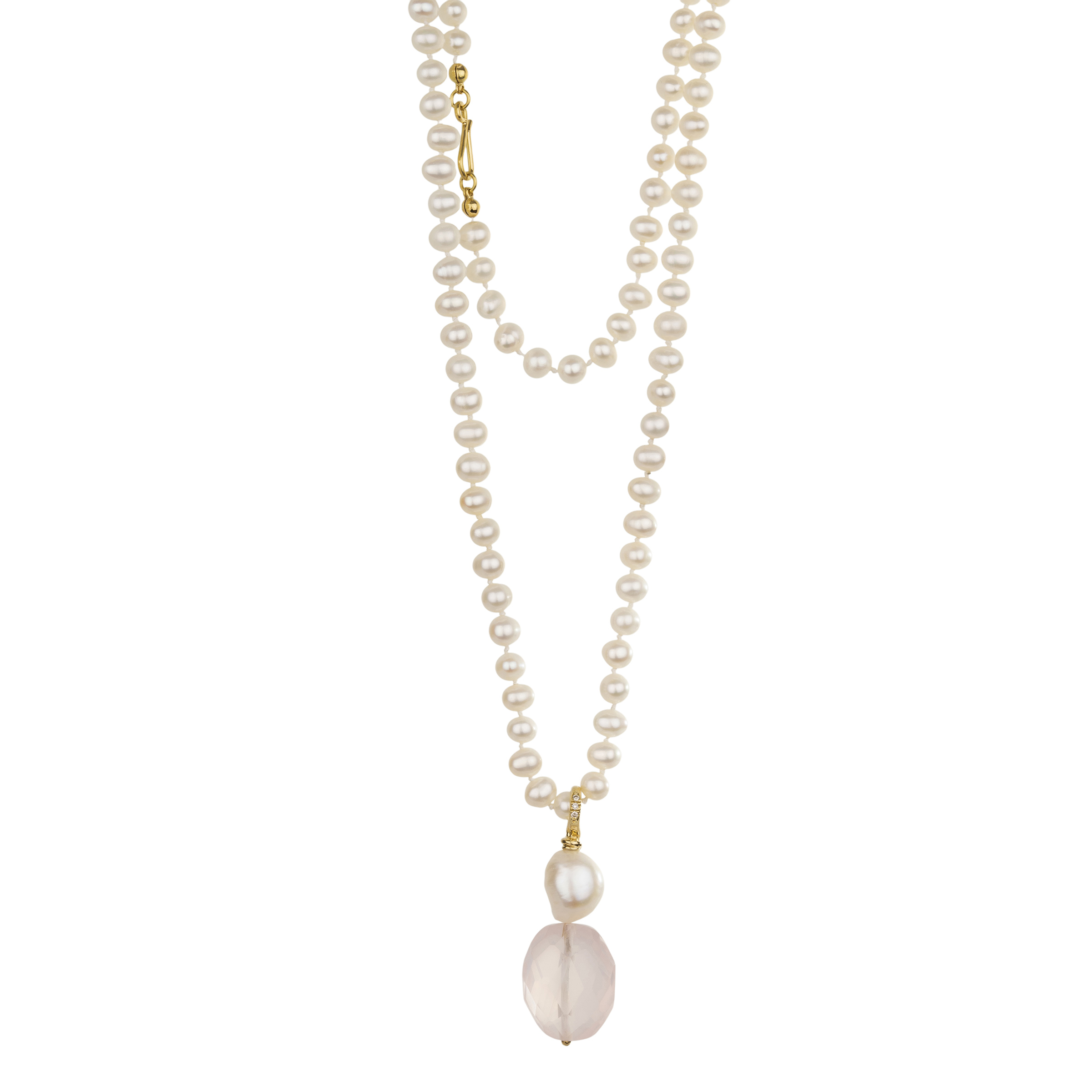 H. STERN. Colar de pérolas (4,6mm a 9,8mm) com ouro amarelo, quartzo rosa e 0,02ct de brilhantes. Medidas 3,8cm/153cm.