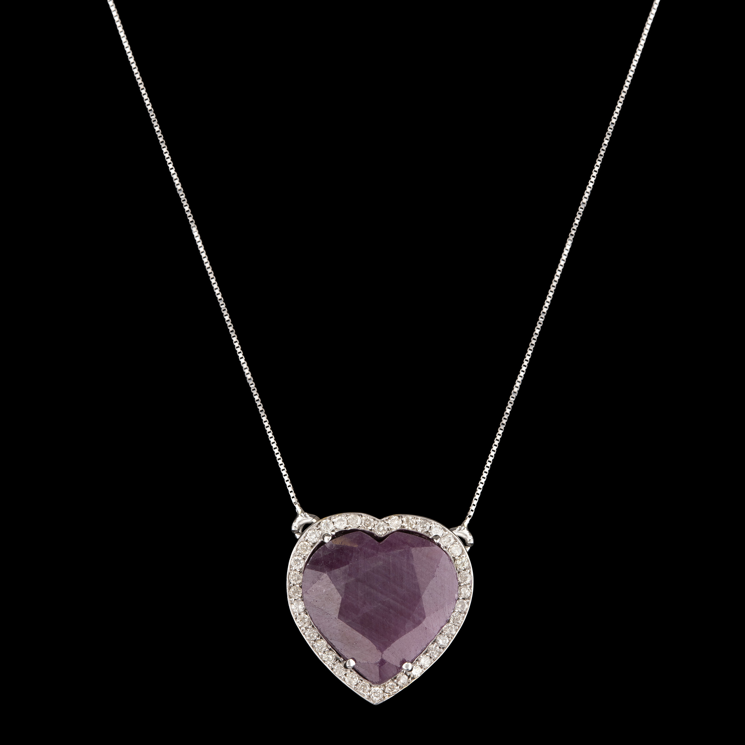 Corrente com pingente de ouro branco, rubi e 0,35ct de brilhantes. Medidas 1,8cm/42cm.