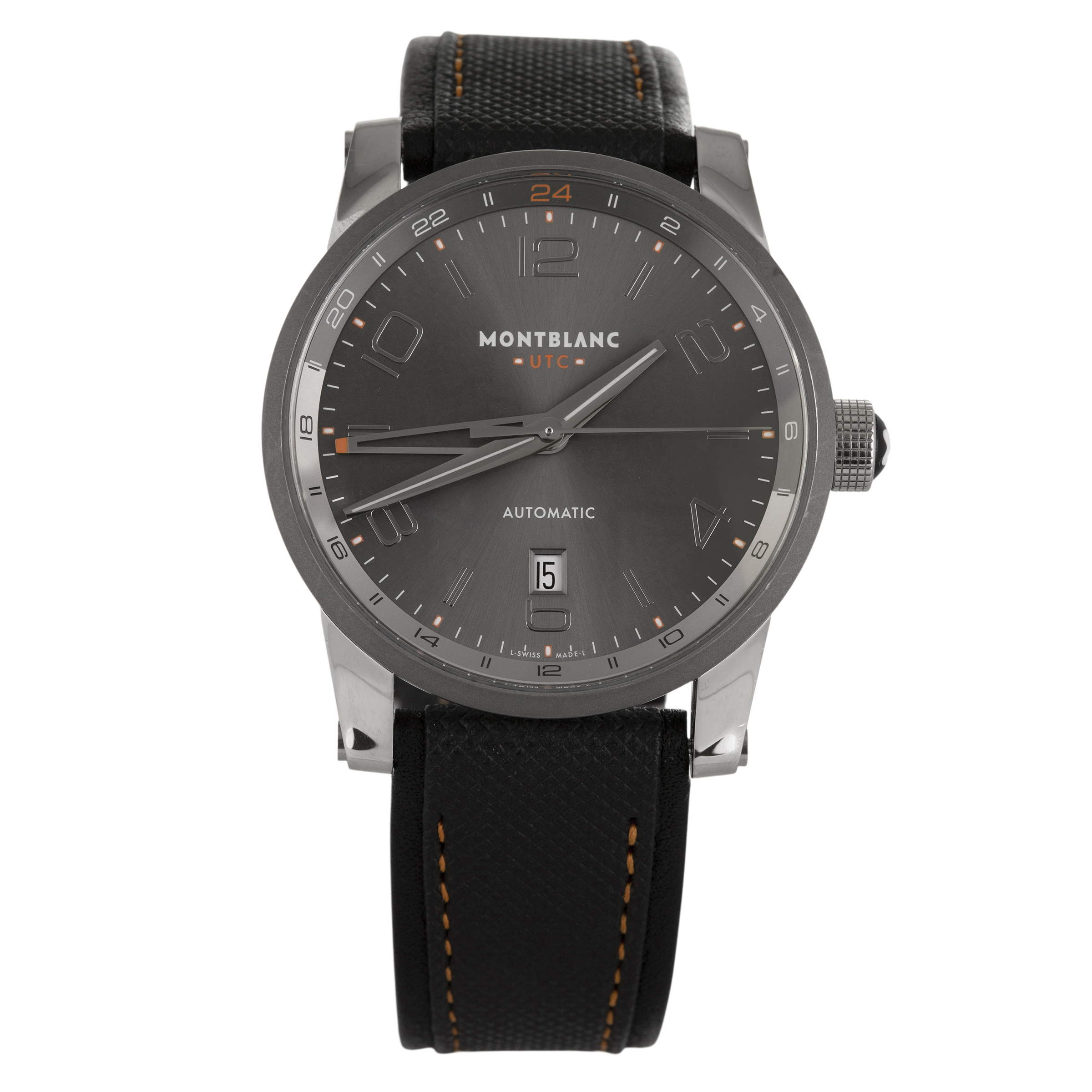 MONTBLANC. Relógio Timewalker UTC de aço com movimento automático, calendário, vidro de safira, anos 2015. Caixa 42mm. Pulseira de couro 22cm.