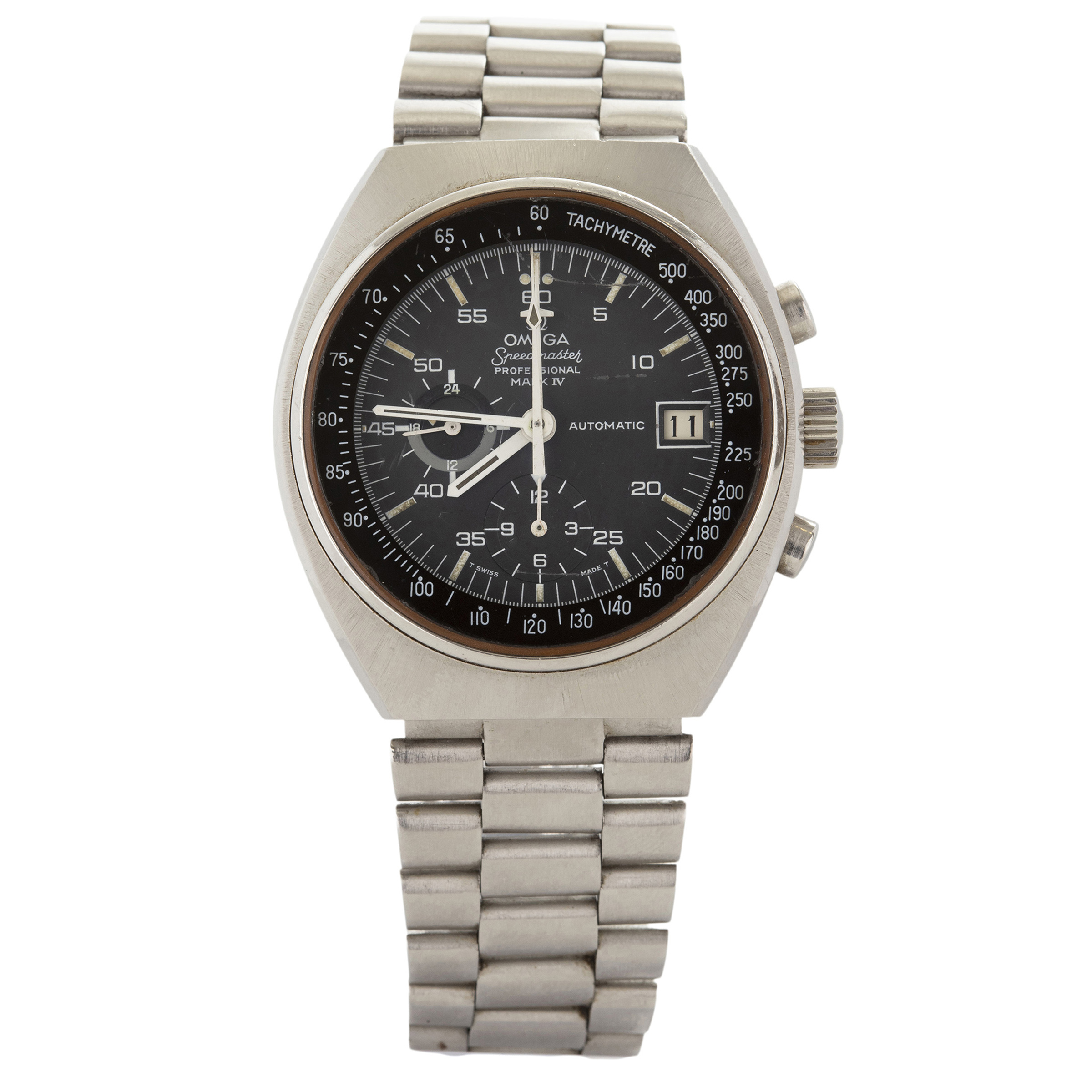 OMEGA. Relógio Mark IV de aço com movimento automático, cronógrafo, calendário, vidro de cristal mineral com detalhes, ano 1983. Com certificado original. Caixa 41mm. Pulseira 19cm.