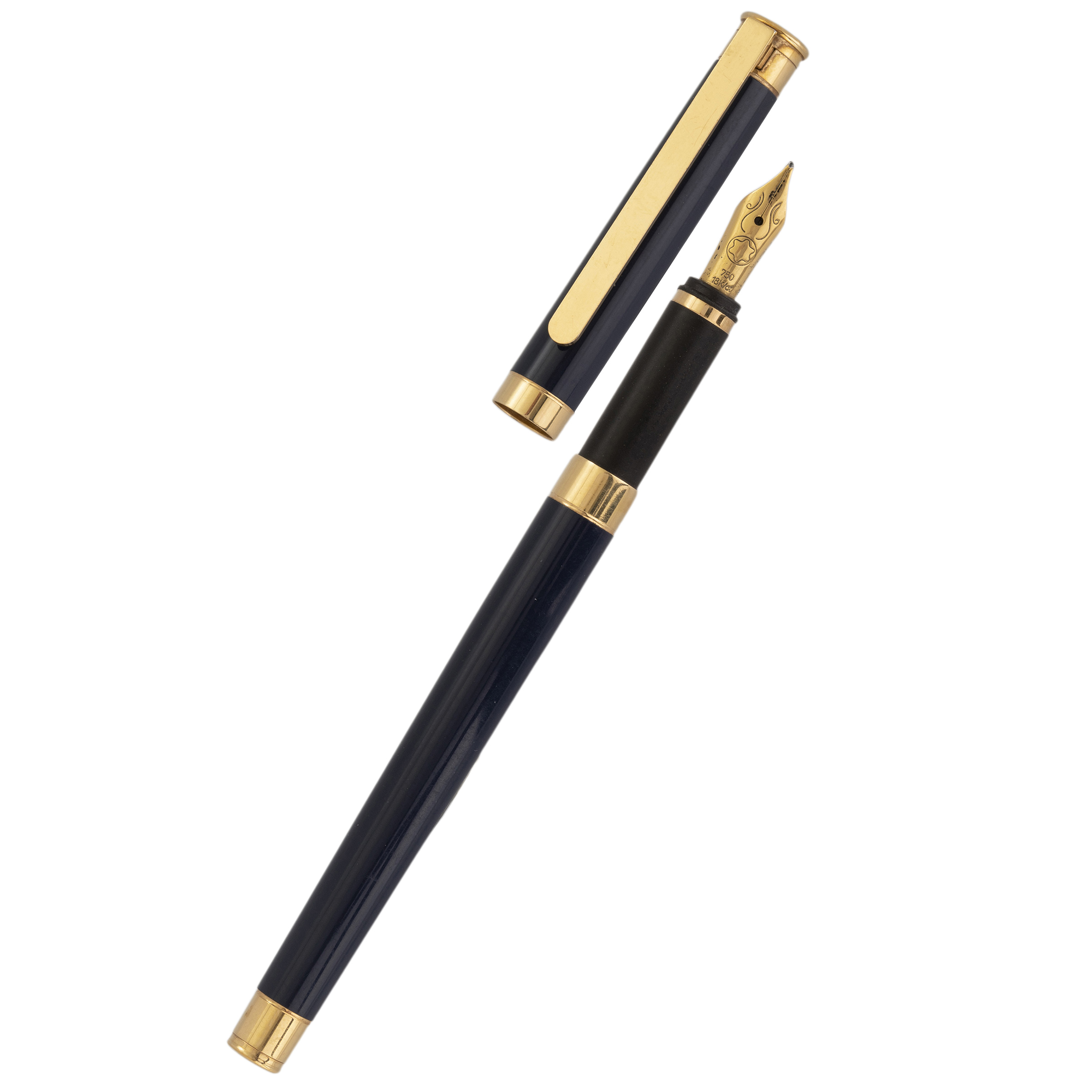 MONTBLANC. Caneta tinteiro com pena em ouro amarelo 18k com resina preciosa azul e detalhes revestidos em ouro amarelo. Com estojo original. Medida 13,8cm.