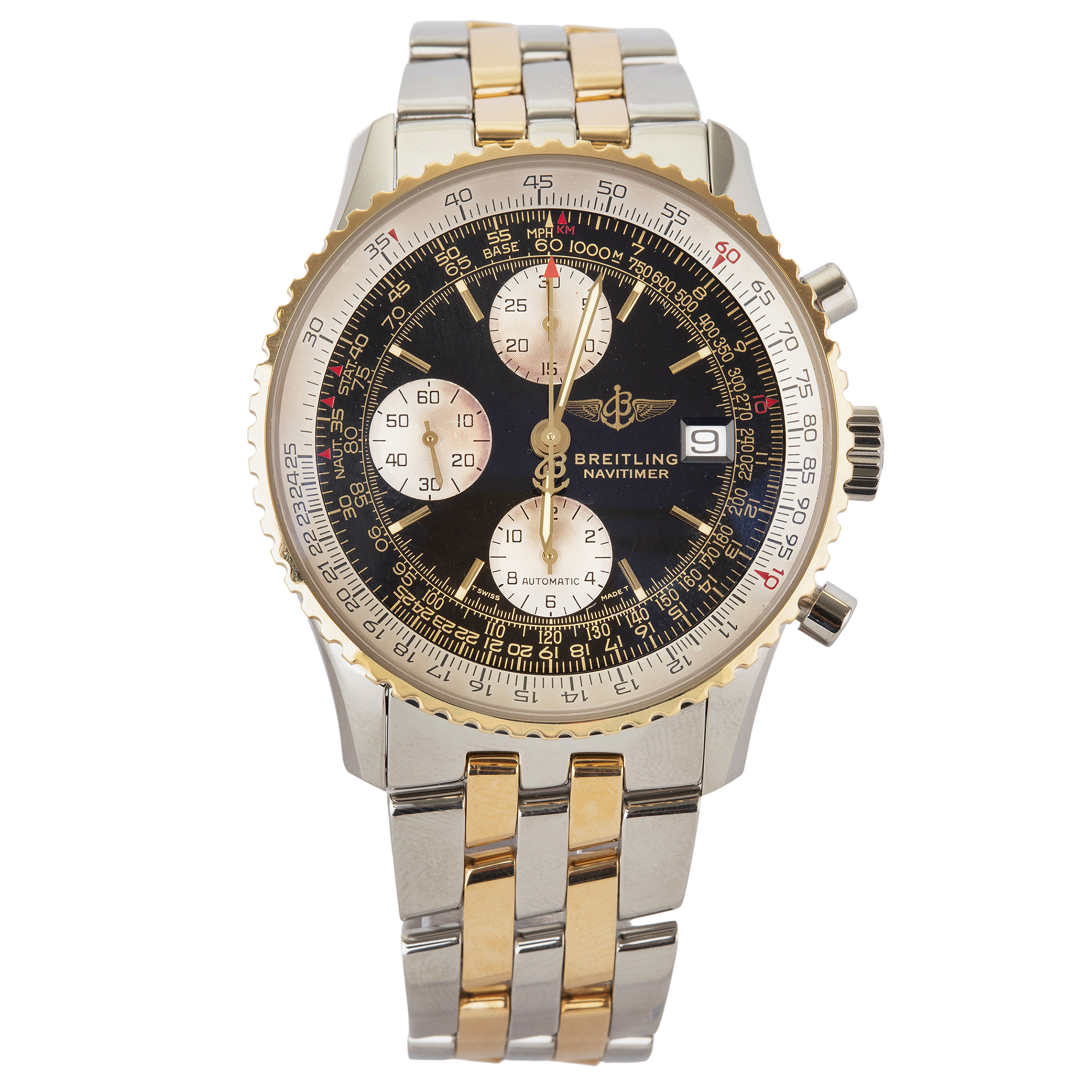 BREITLING. Relógio Navetimer de aço e ouro amarelo com movimento automático, cronógrafo, calendário, vidro de safira, anos 90. Caixa 41mm. Pulseira 20cm.