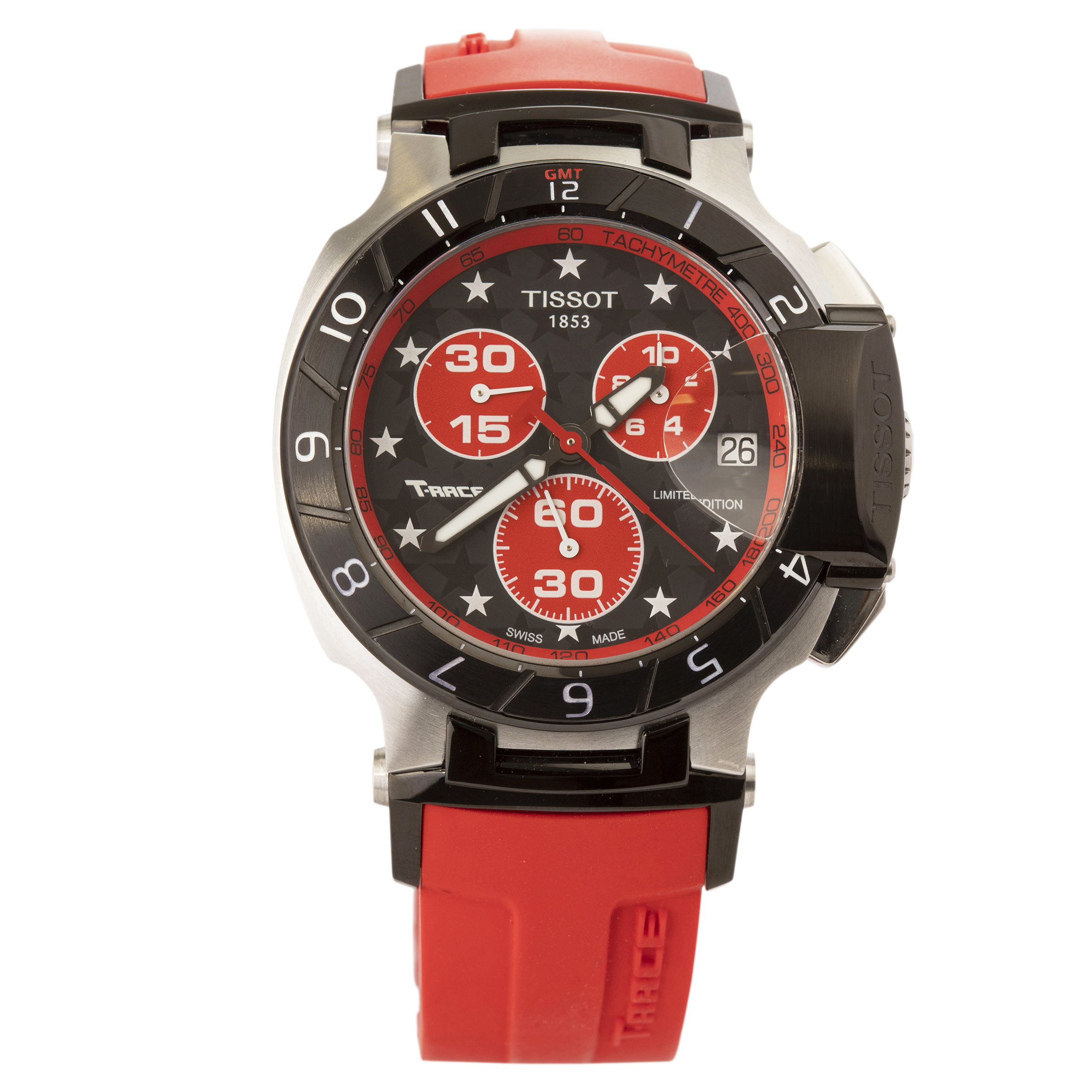 TISSOT. Relógio T Race Nicky Haiden de aço com movimento a quartzo, cronógrafo, calendário, vidro de safira, anos 2000. Caixa 44mm. Pulseira de borracha 22cm.
