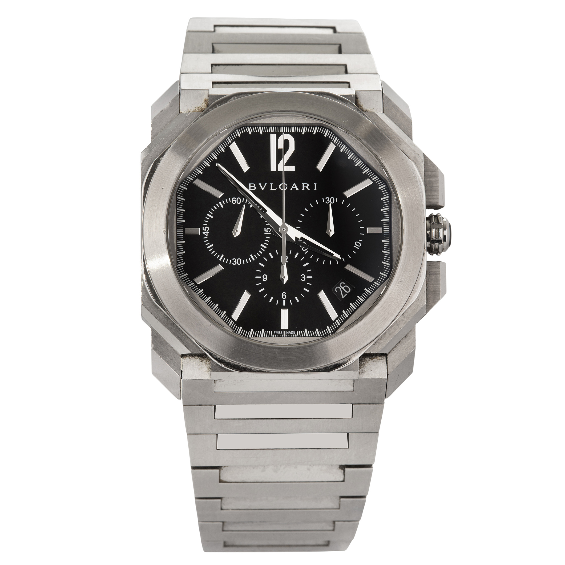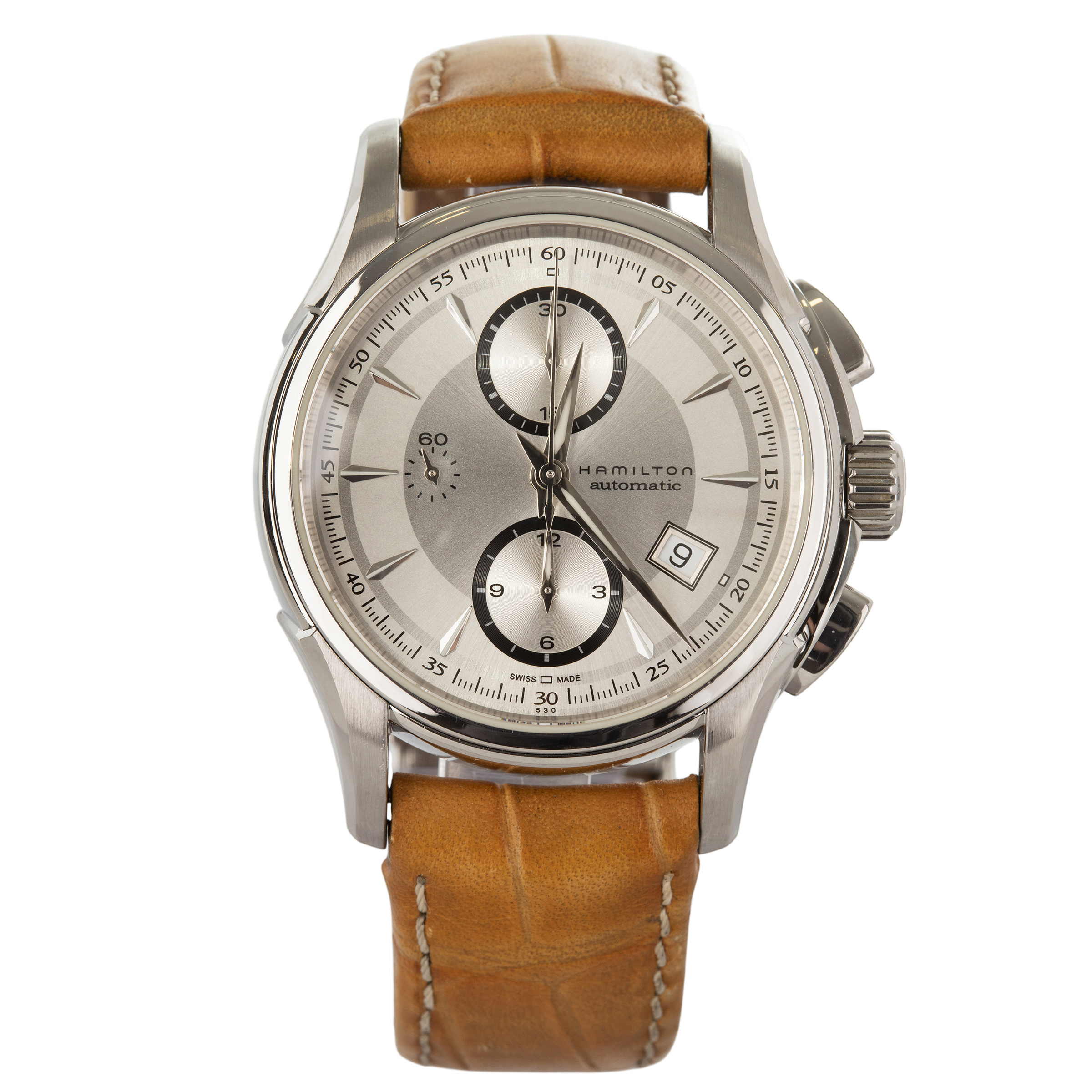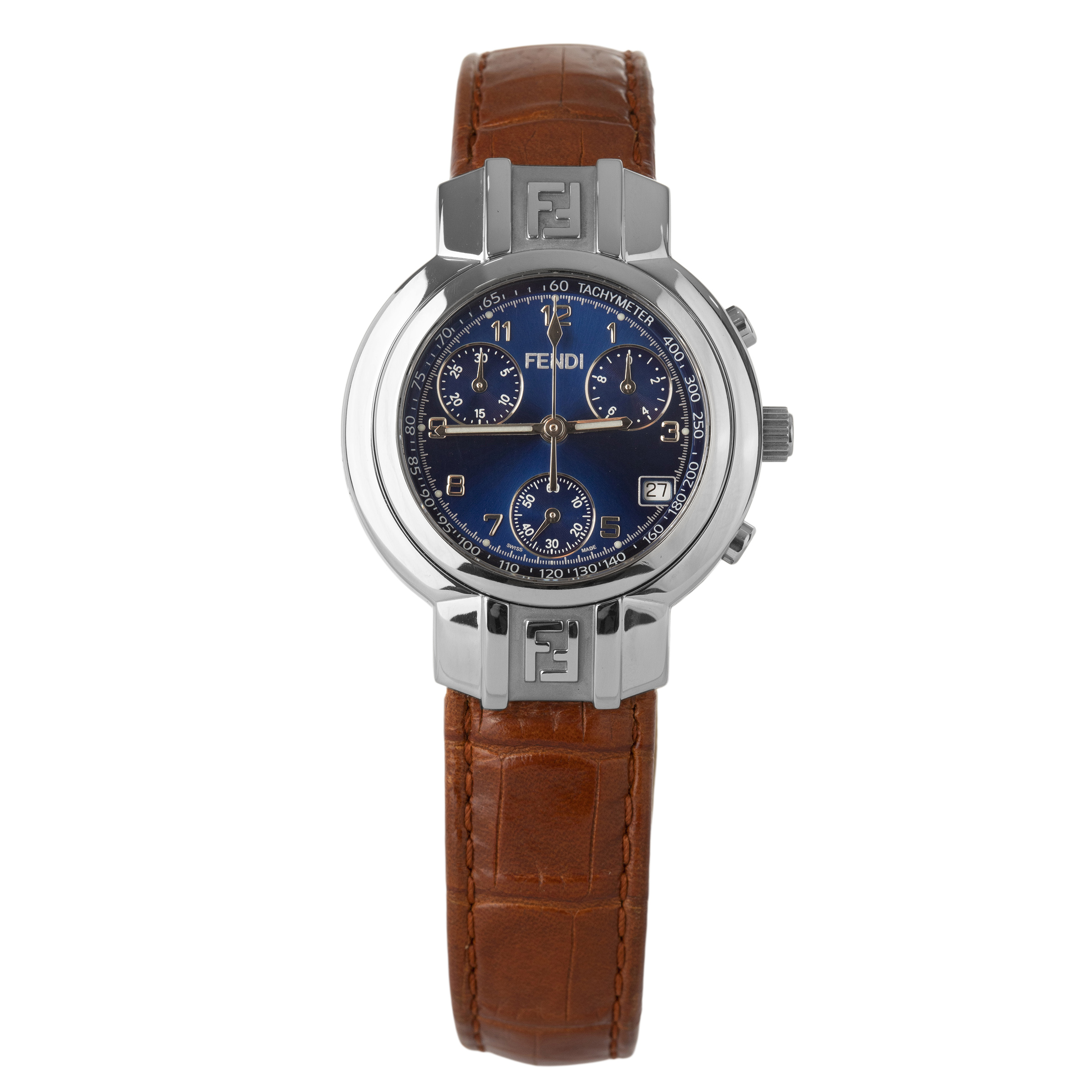 FENDI. Relógio Orologi de aço com movimento a quartzo, cronógrafo, calendário, vidro de cristal mineral, anos 2000. Caixa 32mm. Pulseira de couro 19cm.