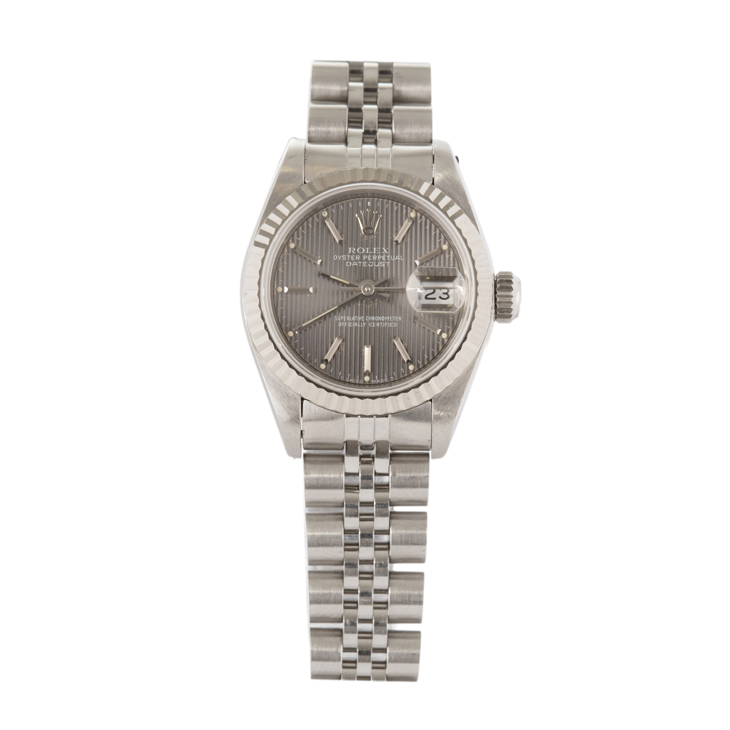 ROLEX. Relógio Datejust de aço com aro de ouro branco, movimento automático, calendário, vidro de safira, ano 1987. Caixa 26mm. Pulseira jubileu 16,5cm.