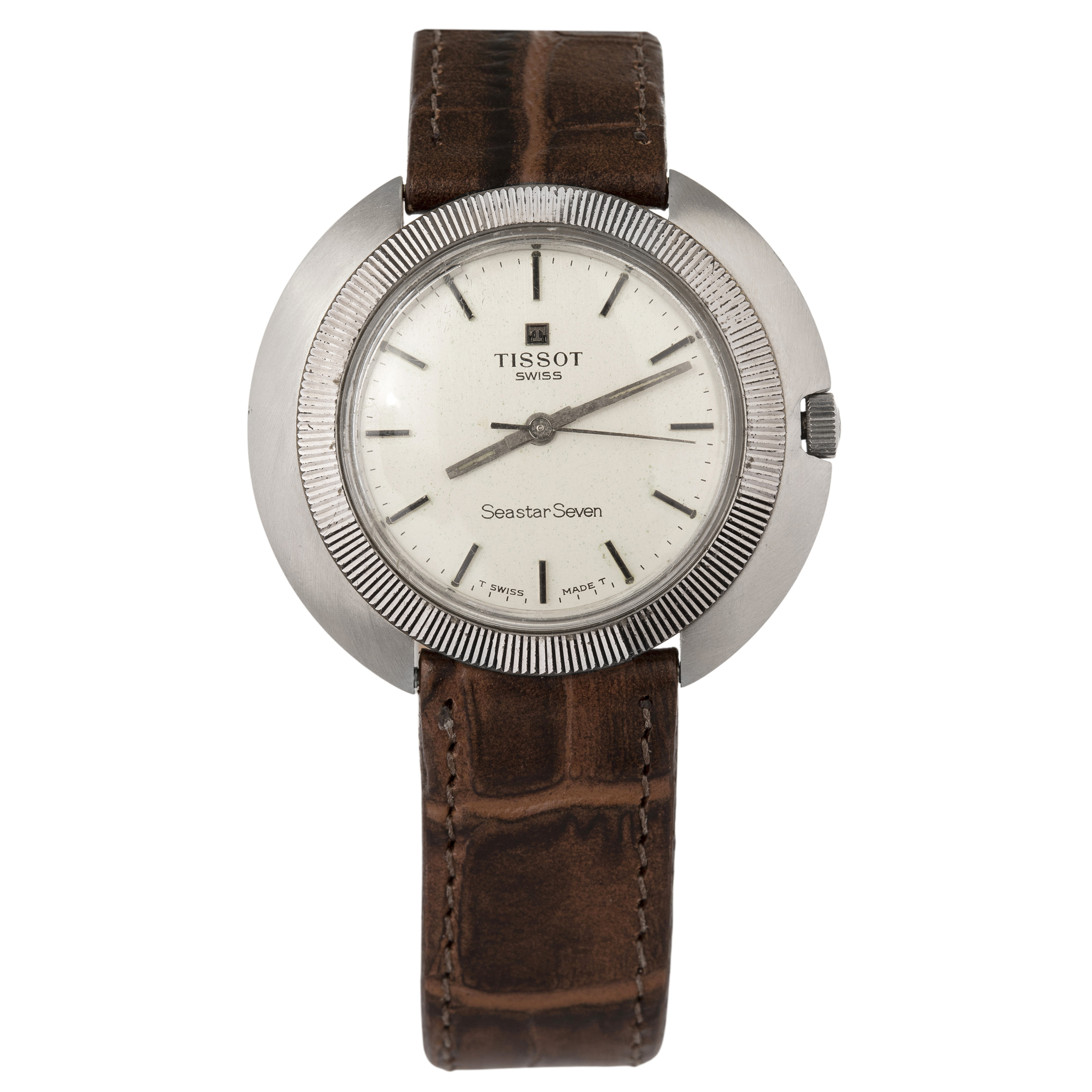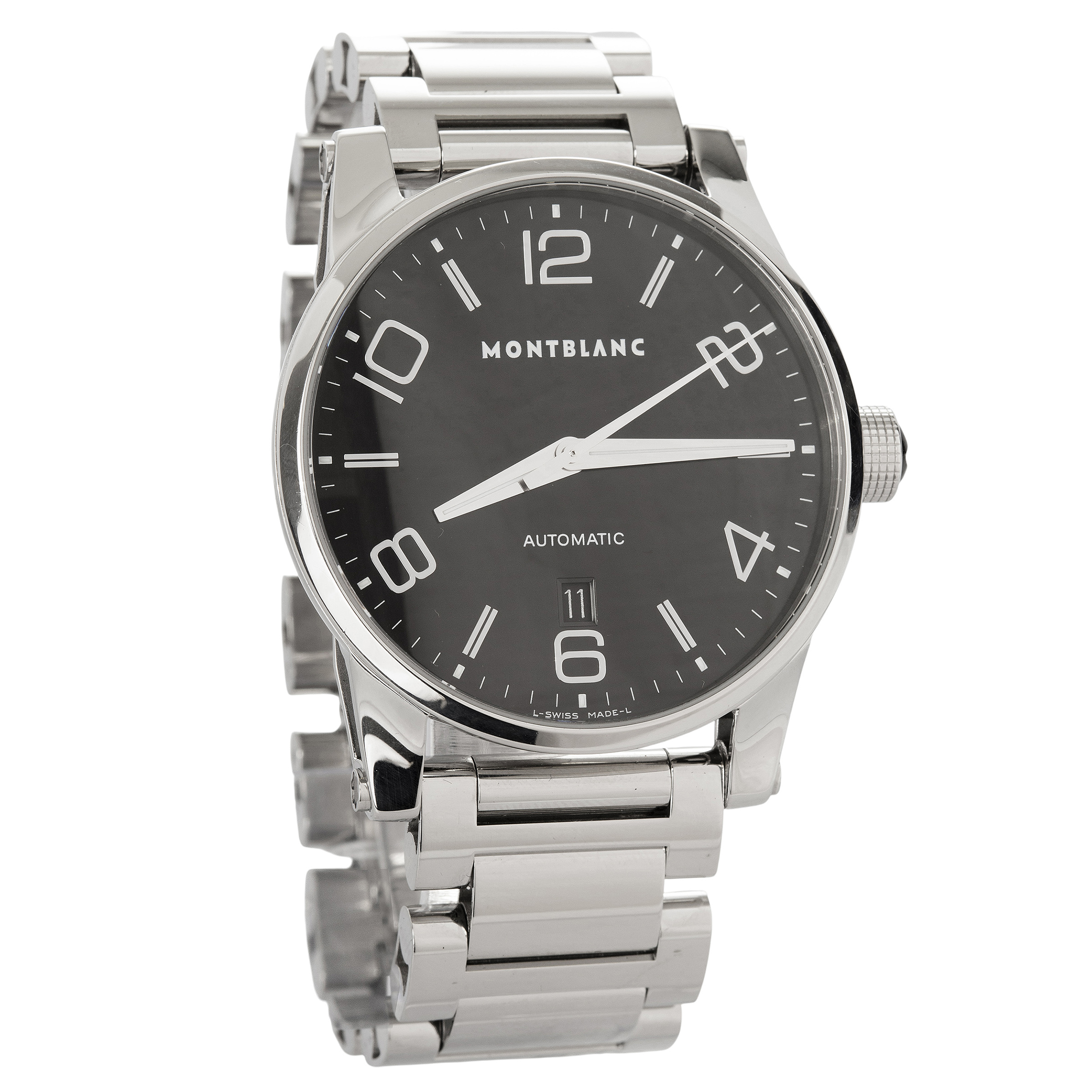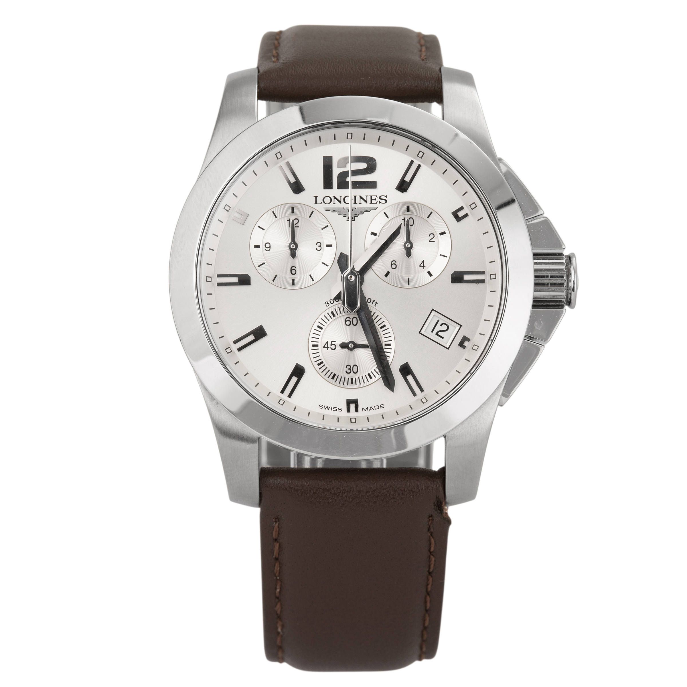 LONGINES. Relógio Conquest de aço com movimento a quartzo, cronógrafo, calendário, vidro de safira, anos 2000. Caixa 41mm. Pulseira de couro não original 22cm.