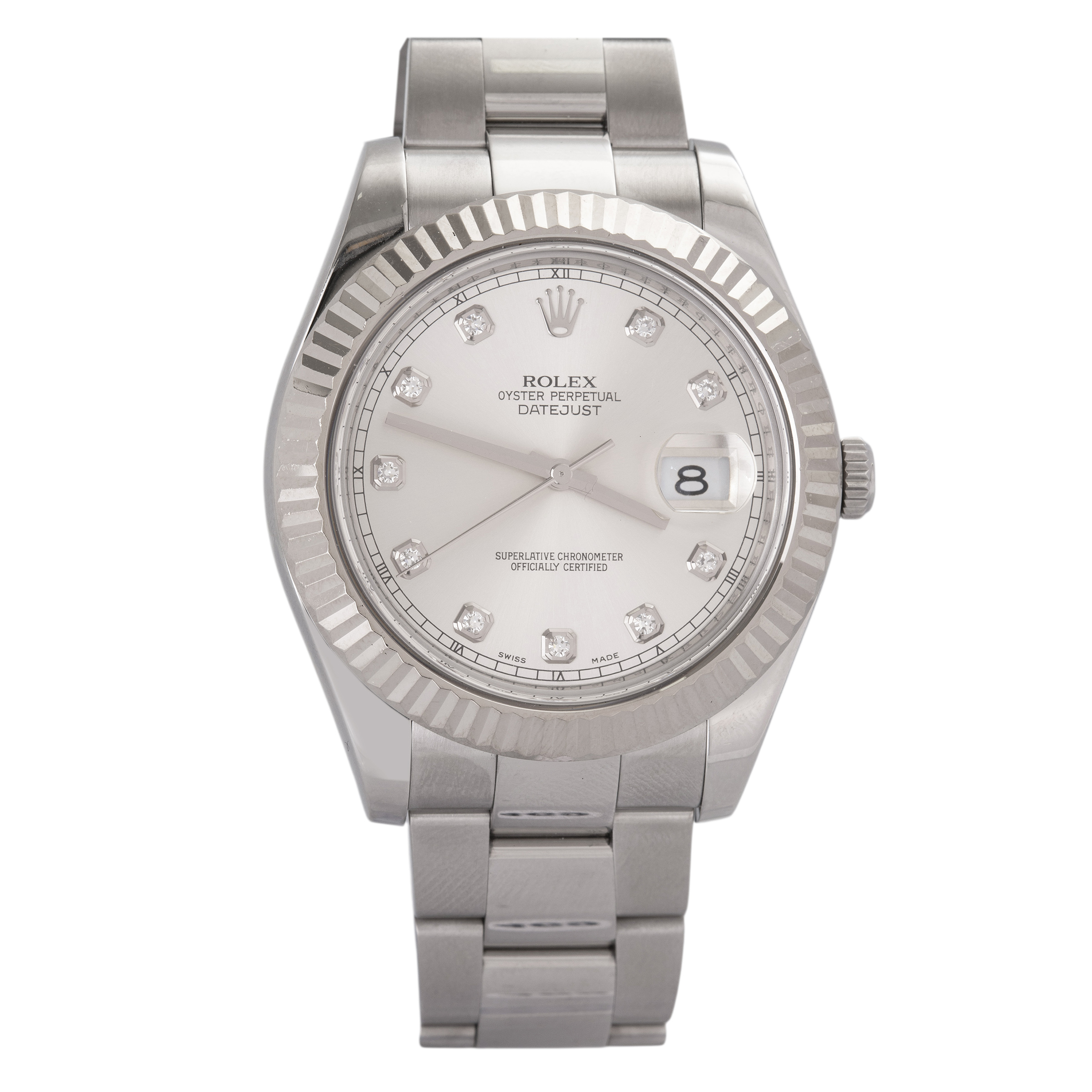 ROLEX. Relógio Datejust II de aço com aro de ouro branco, 0,10ct de brilhantes, movimento automático, calendário, vidro de safira, ano 2011. Com estojo e certificado originais. Caixa 41mm. Pulseira oyster 18cm.