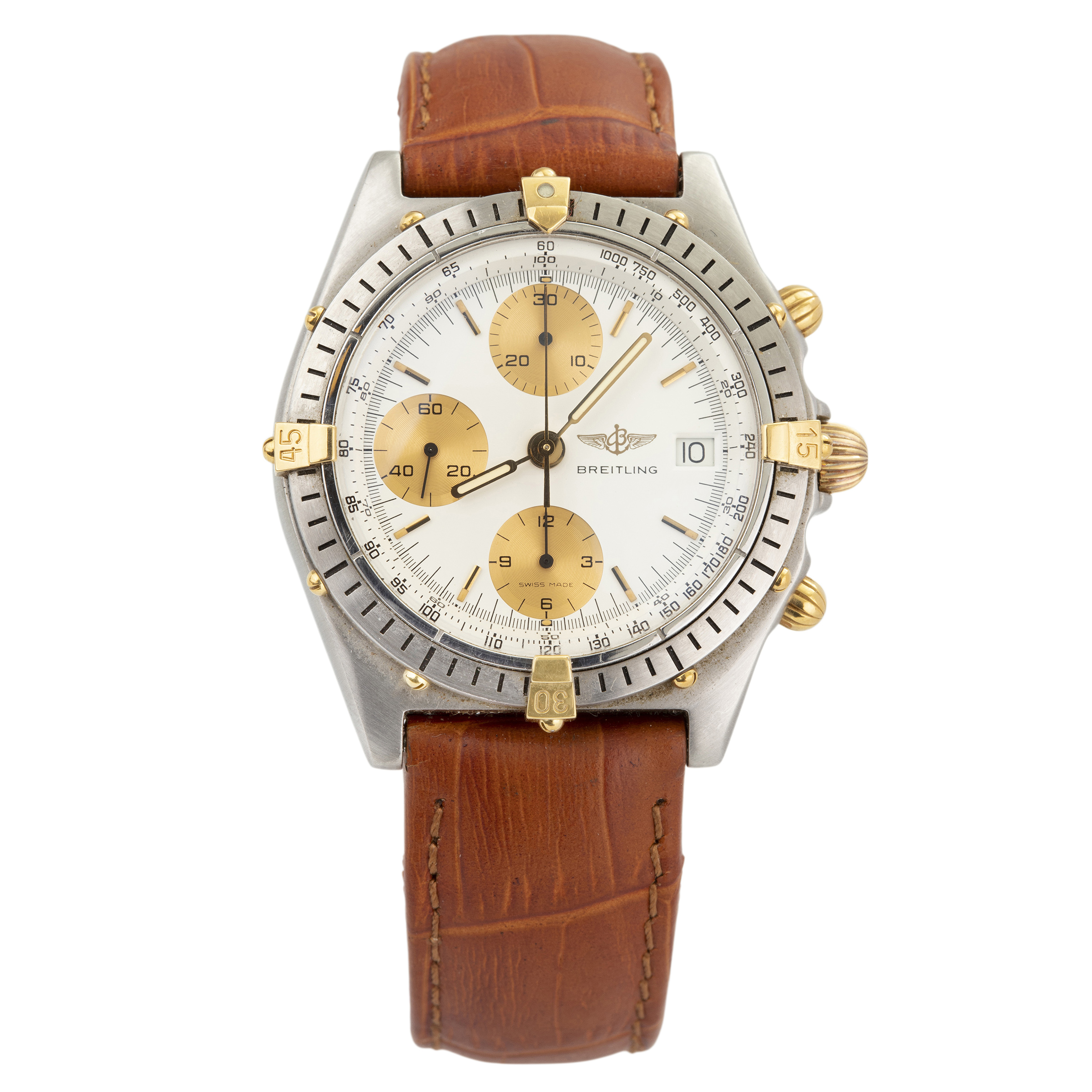 BREITLING. Relógio Chronomat de aço e plaqué de ouro amarelo com movimento automático, cronógrafo, calendário, vidro de safira, anos 90. Caixa 40mm. Pulseira de couro não original 22cm.