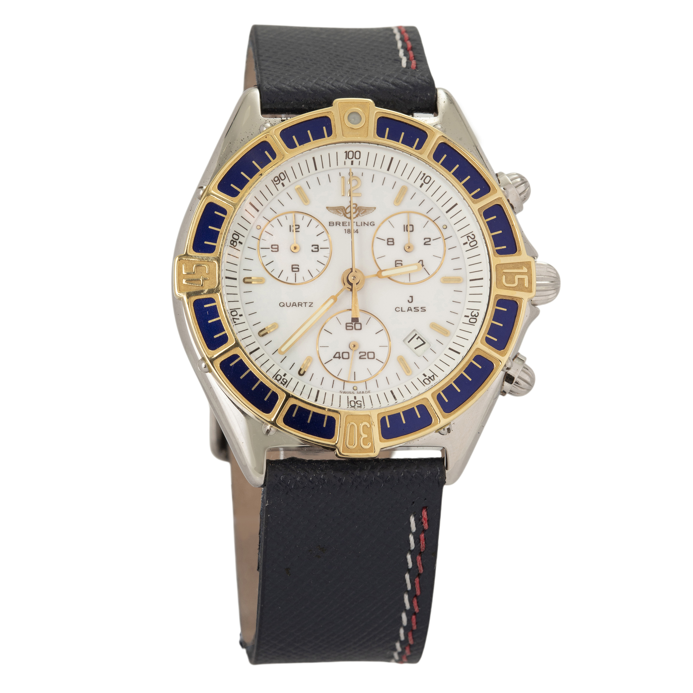 BREITLING. Relógio J Class de aço com aro de ouro amarelo, movimento a quartzo, cronógrafo, calendário, vidro de safira, ano 1991. Com estojo e certificado originais. Caixa 40mm. Pulseira de couro não original 22cm.