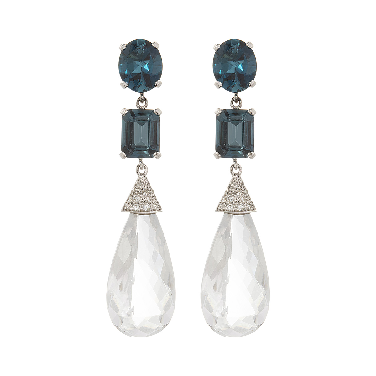 Brinco de ouro branco com topázios azuis, cristais, 0,50ct de brilhantes e 21,6g. Medida 6cm.