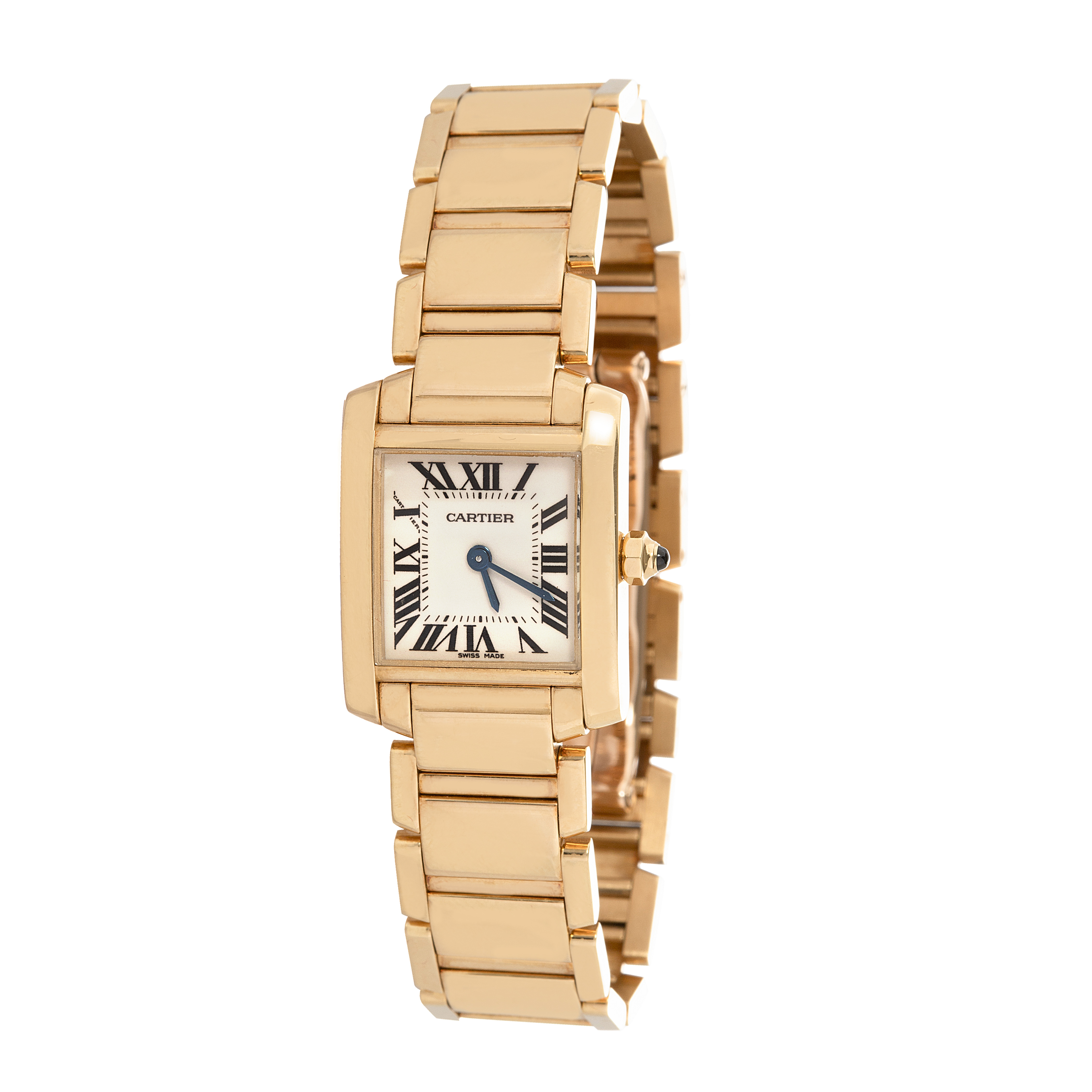CARTIER. Relógio Tank Francês de ouro amarelo com vidro de safira, movimento a quartz, ano 2001. Caixa 20x25mm. Pulseira 18cm. Com certificado original.