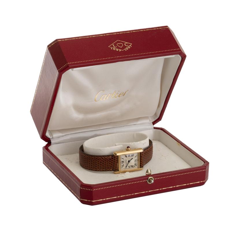 Relógio CARTIER Must com caixa de aço e plaqué, pulseira de couro, movimento a quartz, vidro de safira. Caixa 20x28cm. Pulseira 19cm. Com caixa original.