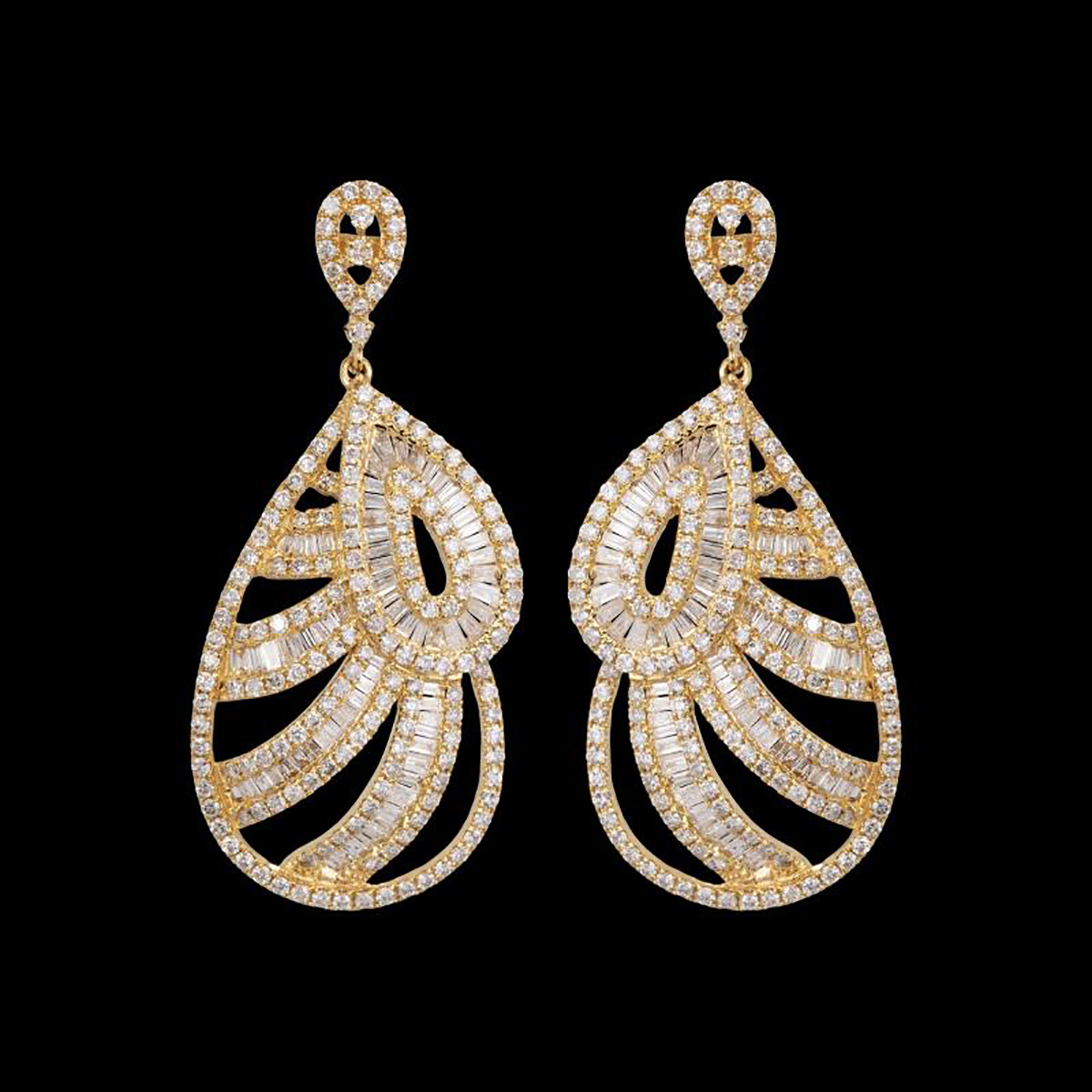 Brinco de ouro amarelo com 3,50ct de diamantes (sendo 1,50ct de lapidação baguete/2,00ct de lapidação brilhante) e 10,4g. Medida 4,6cm.
