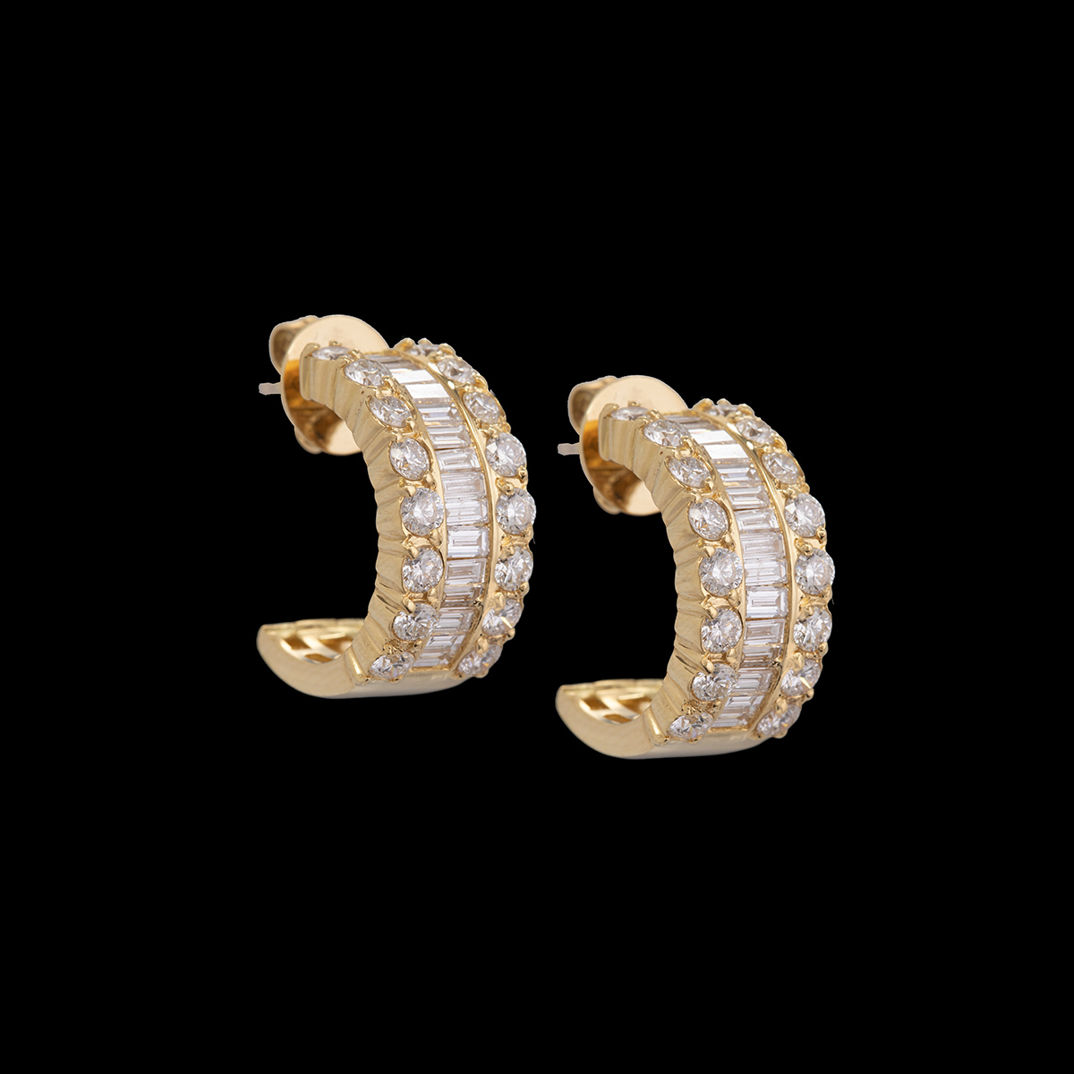 Brinco de ouro amarelo com 4,00ct de diamantes (sendo 1,75ct de lapidação baguete/2,25ct de lapidação brilhante) e 12,1g. Medida 2cm.