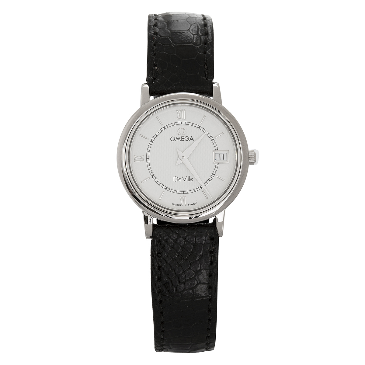 OMEGA. Relógio De Ville de aço com movimento a quartz, calendário, vidro de safira, anos 2000. Caixa 26cm. Pulseira de couro 18cm.
