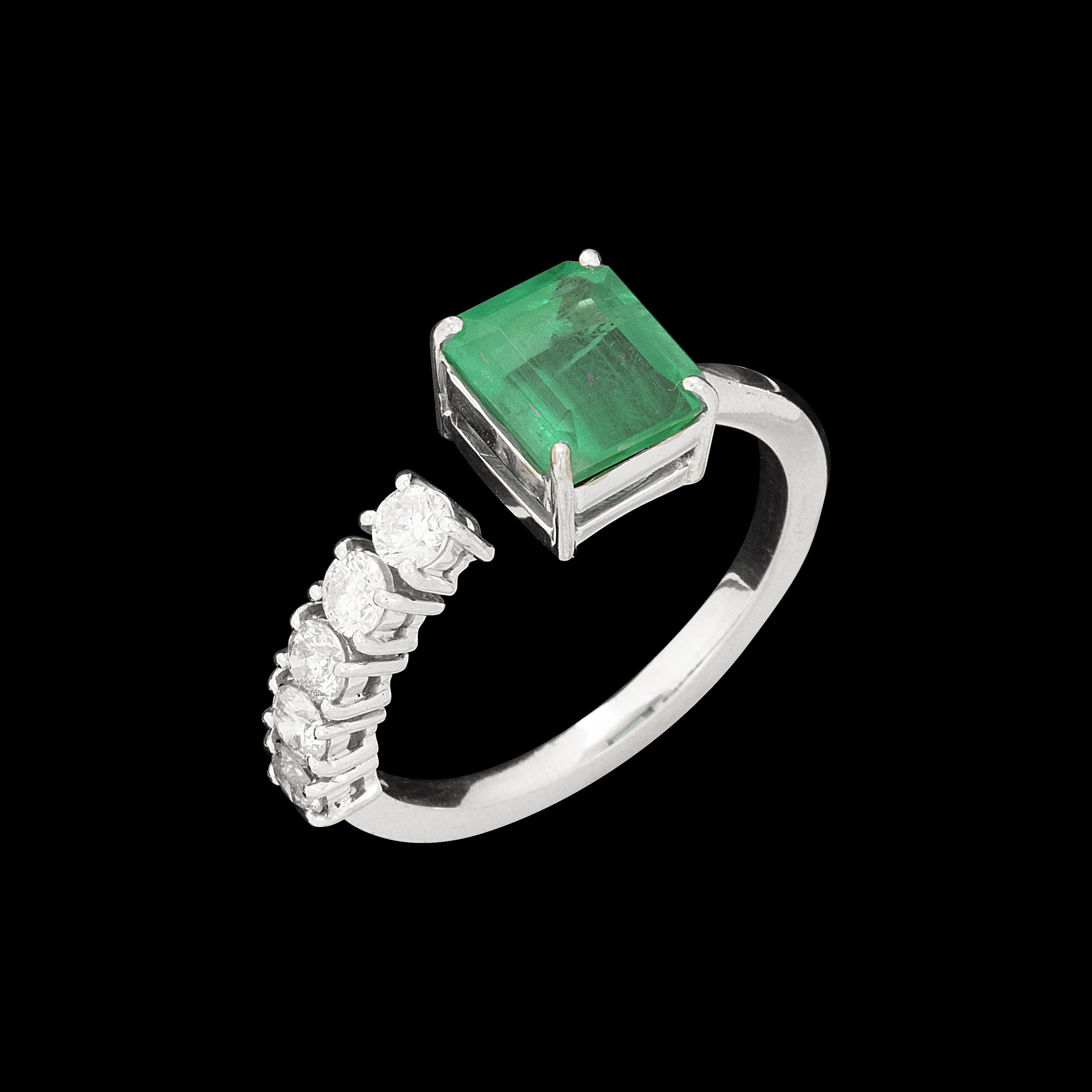 Anel de ouro branco com 1,92ct de esmeralda e 0,53ct de brilhantes. Medida 20.