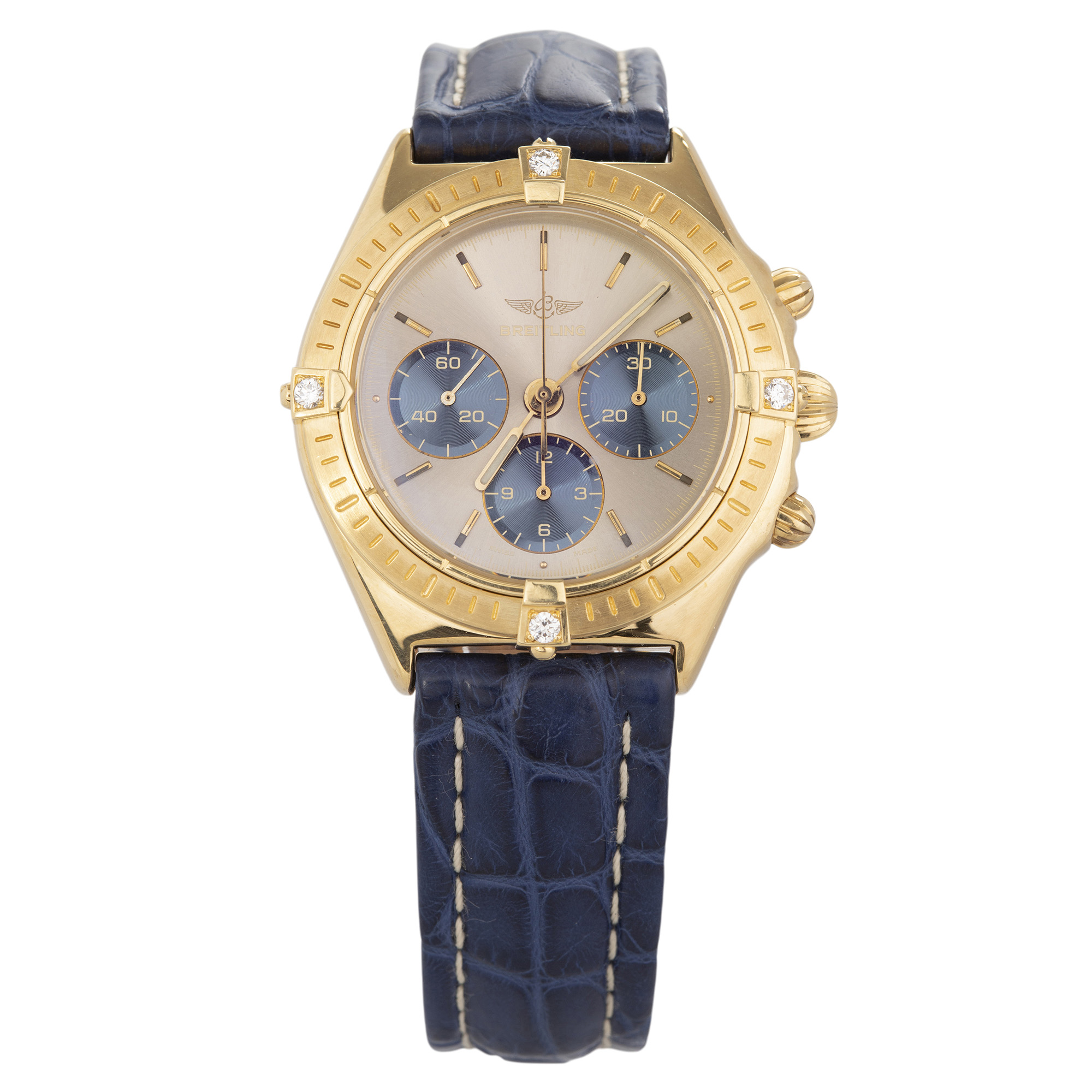 BREITLING. Relógio Callisto de ouro amarelo com 0,16ct de brilhantes, corda manual, cronógrafo, vidro de safira, anos 90. Caixa 36mm. Pulseira de couro 21cm.